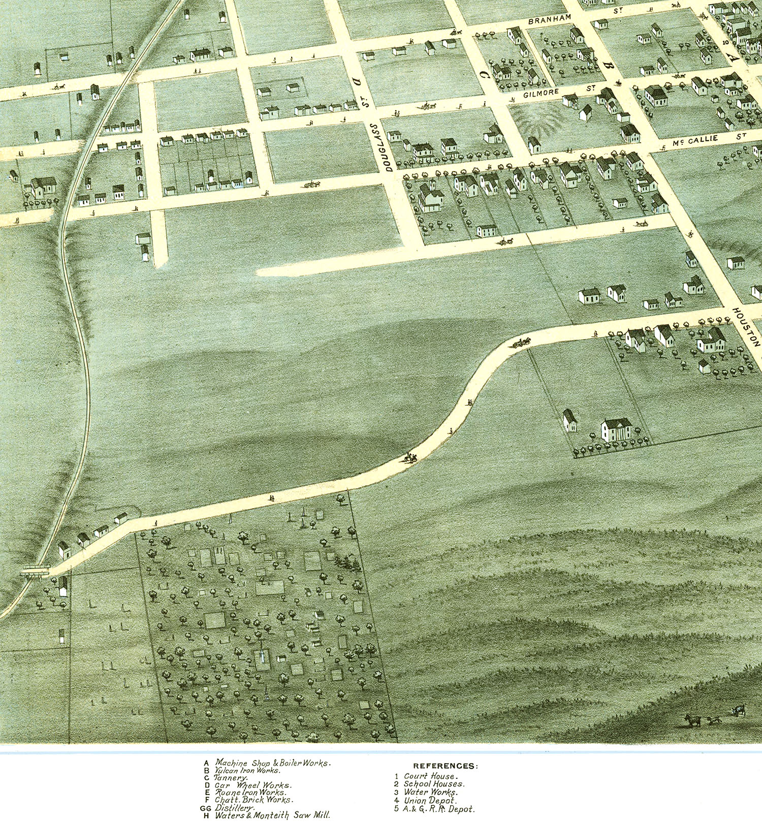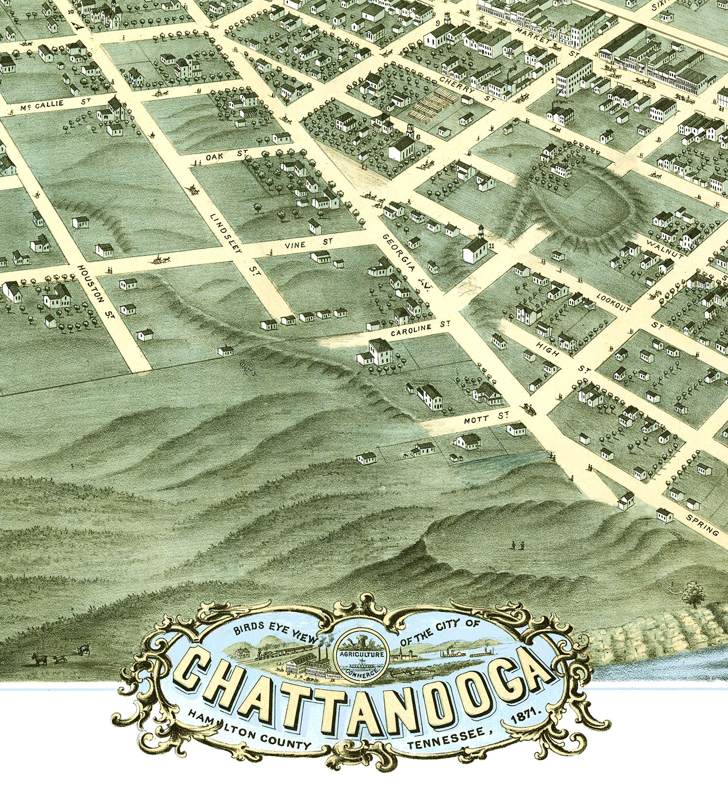 Brilliant, full color, fine art map of Chattanooga, Tennessee in 1871.