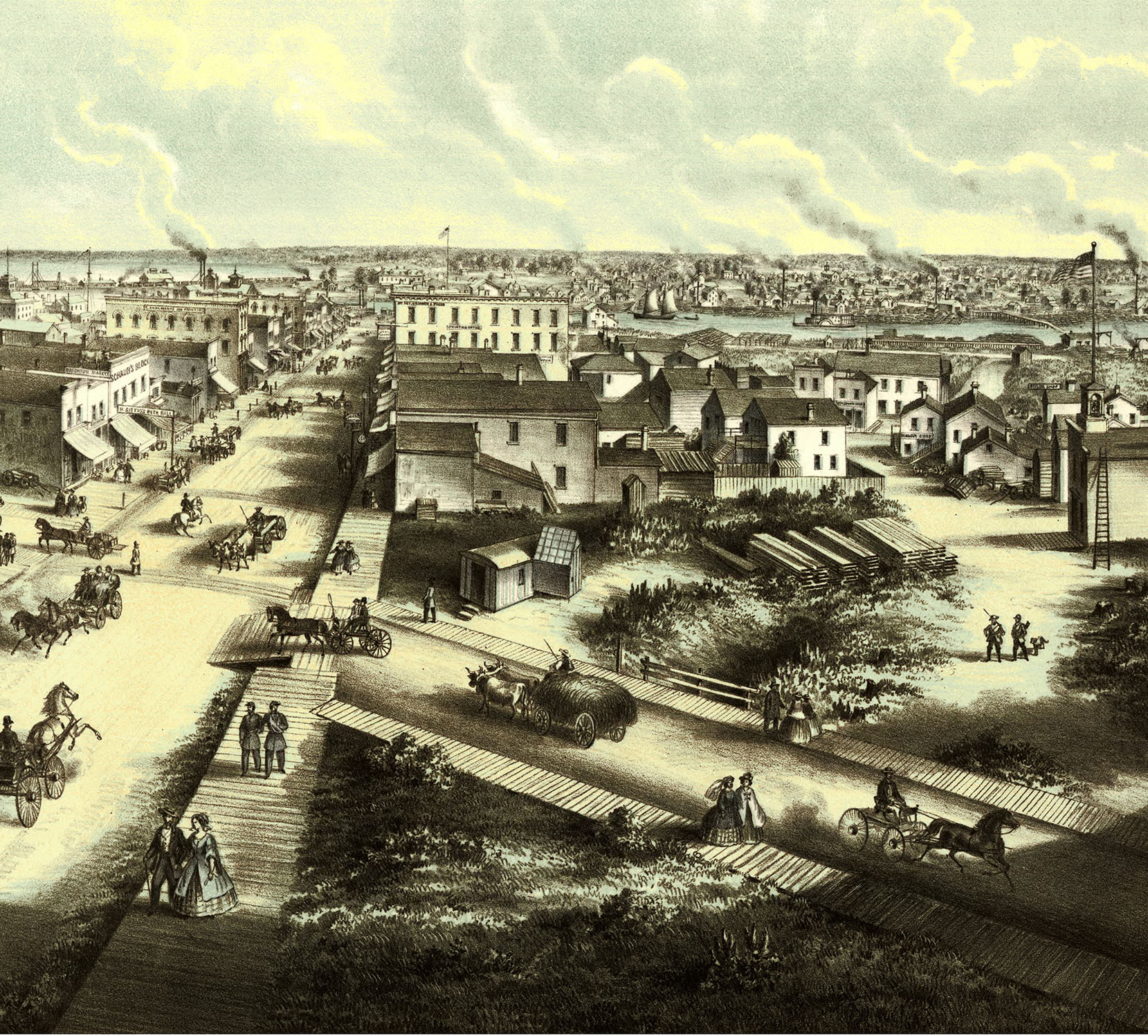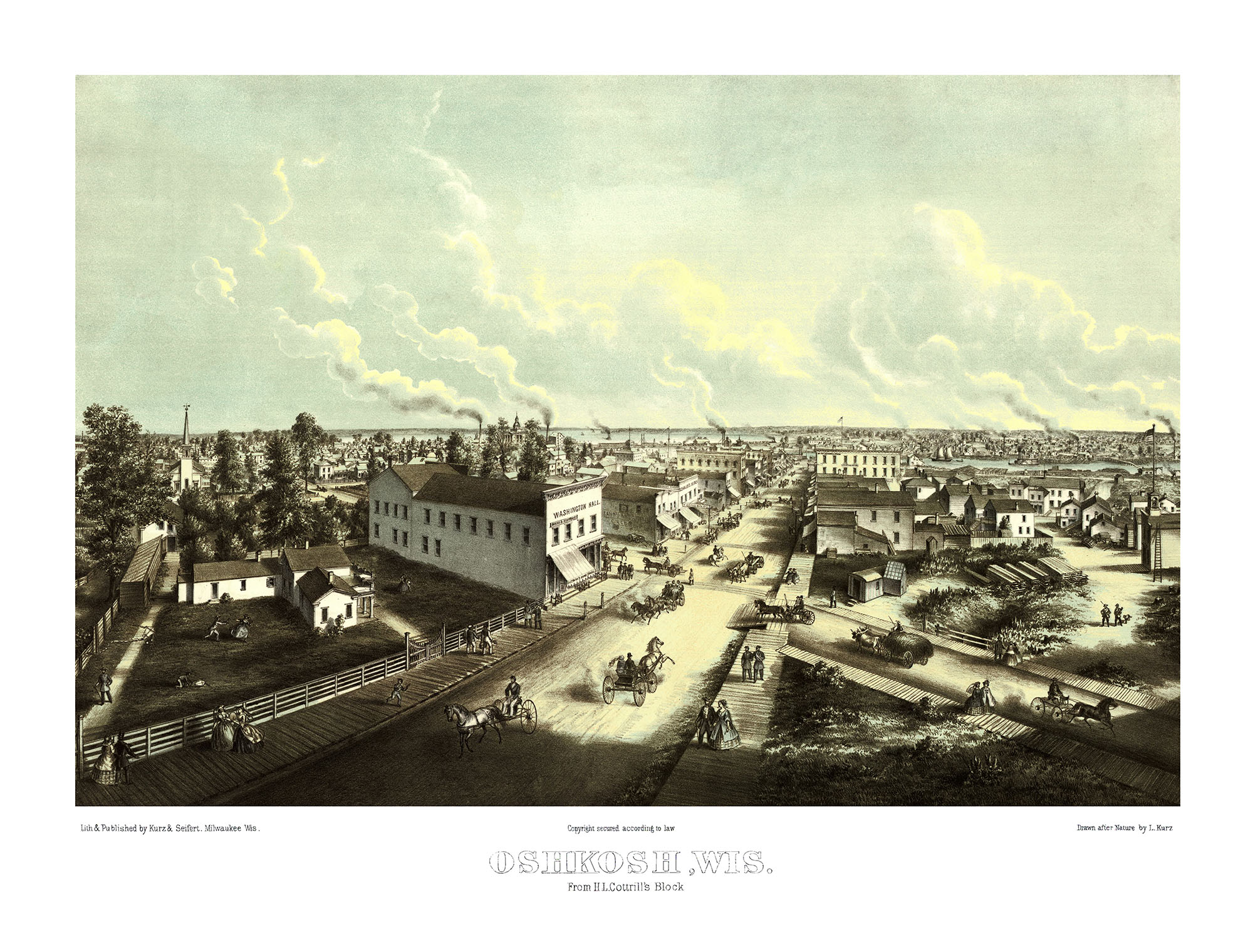 Oshkosh, Wisconsin in 1850 - From H.L. Cottrill's Block, Bird's Eye, Aerial, Panorama, Vintage, Antique, Giclée, Fine Art, Wall Art, History