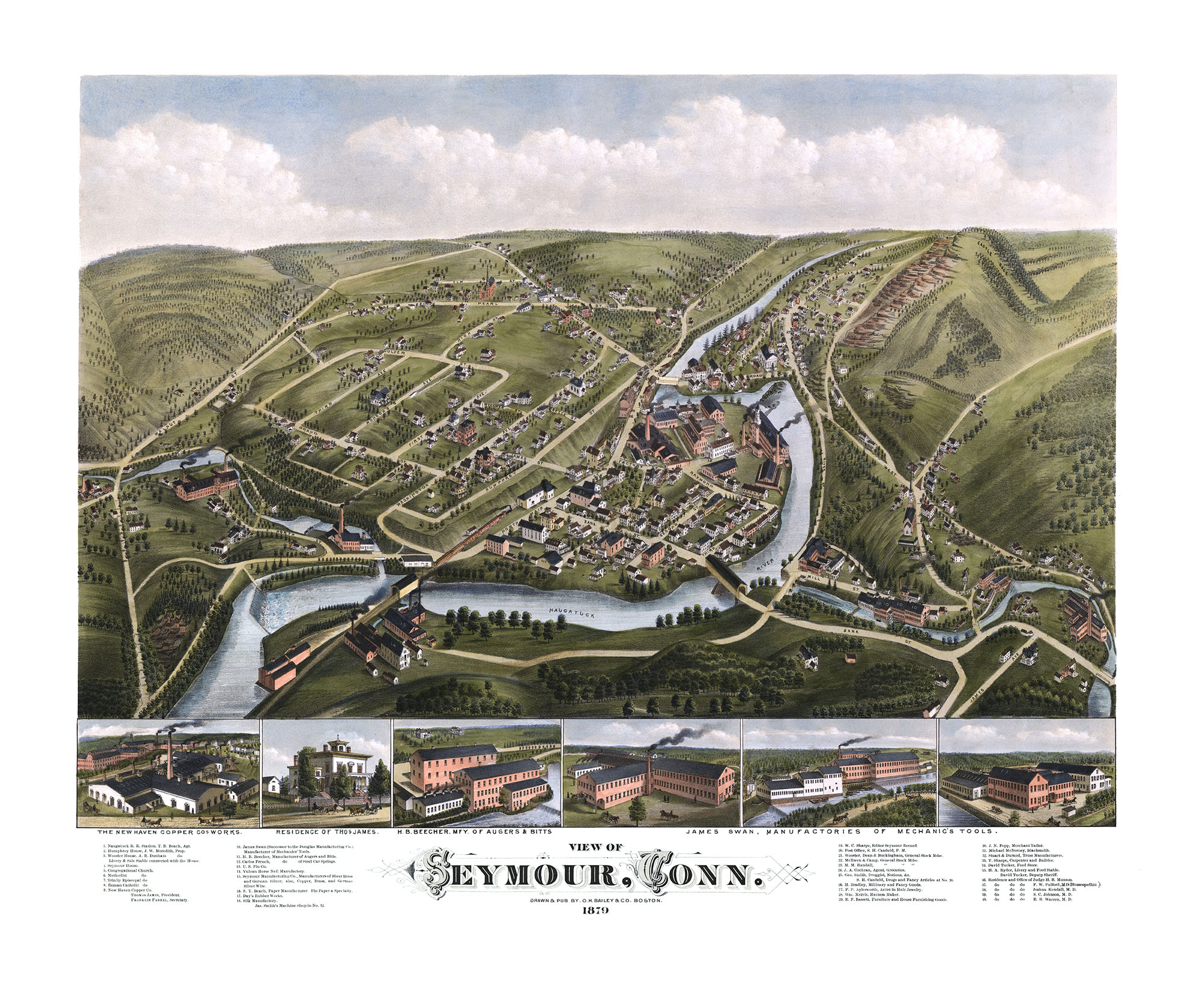Seymour, Connecticut in 1879 - Bird's Eye View Map, Aerial, Panorama, Vintage, Antique, Giclée, Fine Art, Wall Art, History