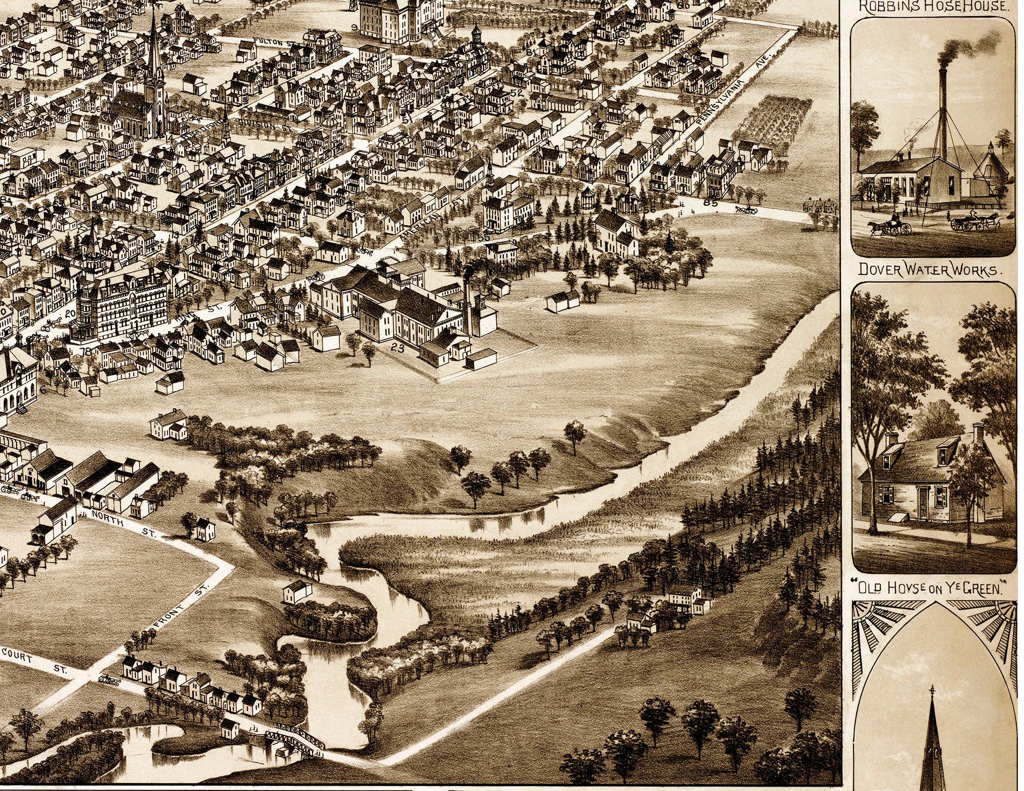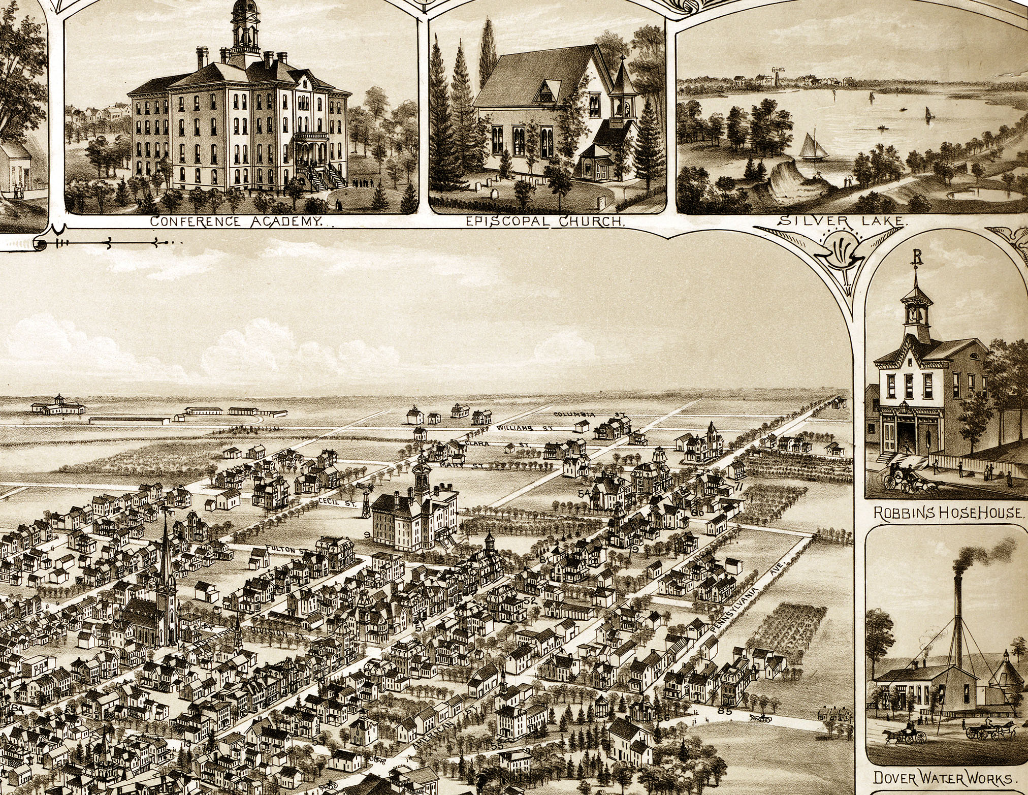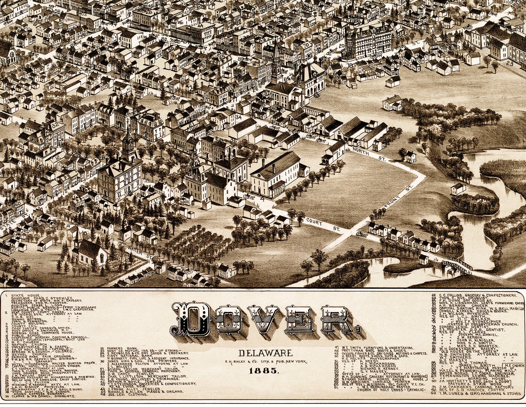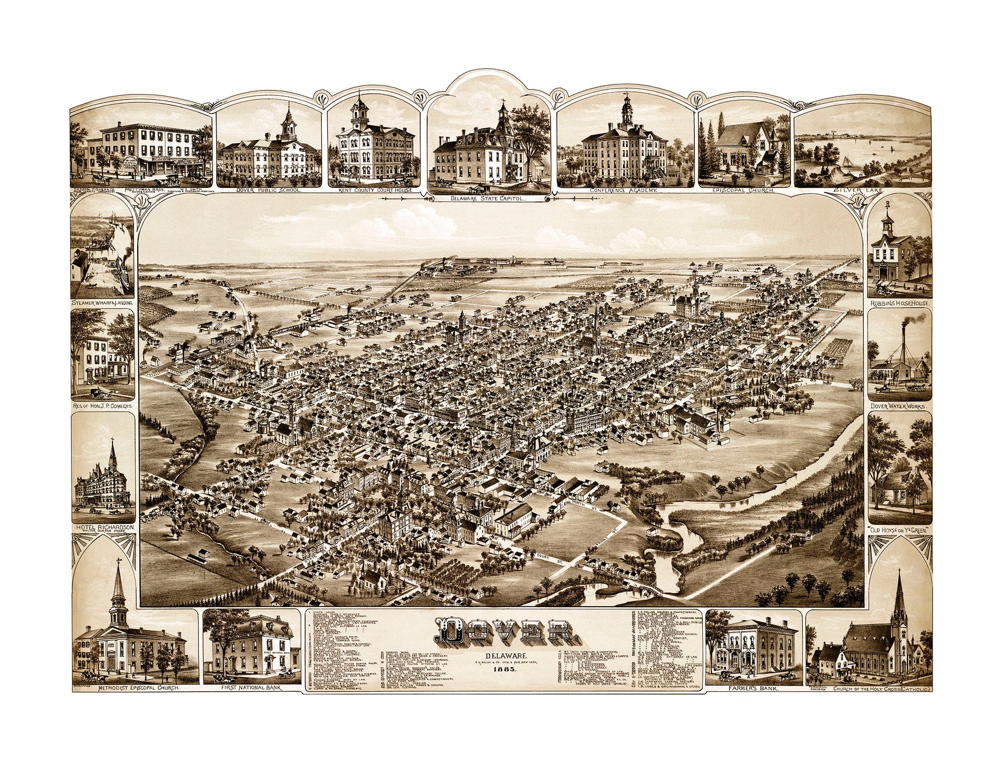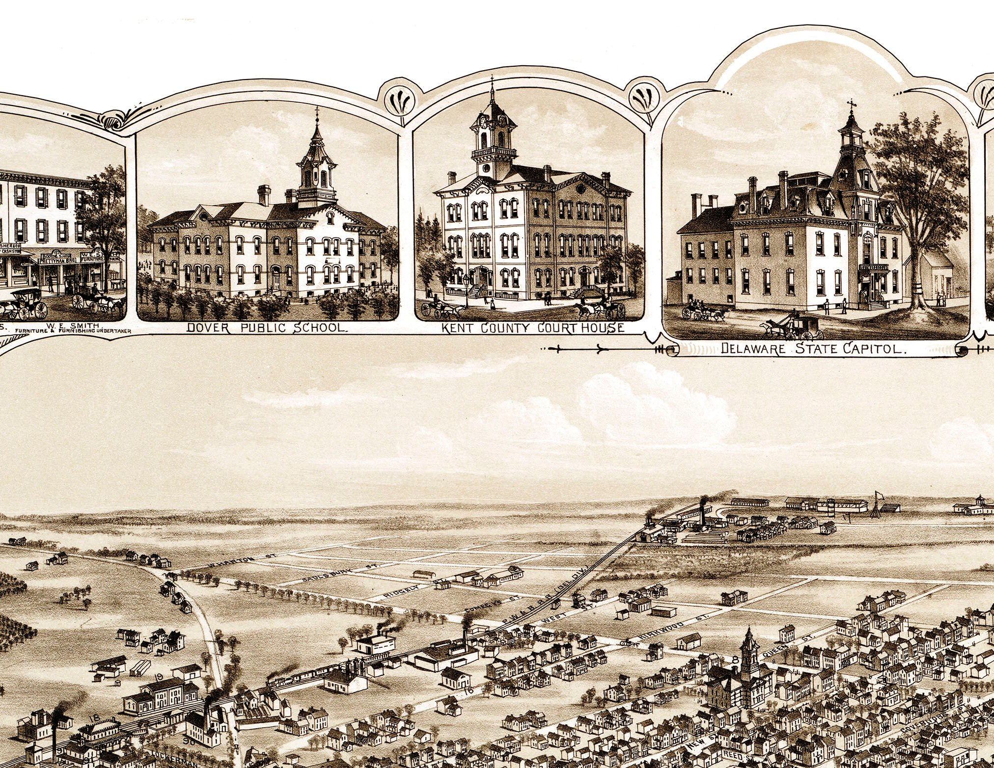 Dover, Delaware in 1885 - Bird's Eye View, Aerial, Panorama, Vintage, Antique, Reproduction, Giclée, Fine Art, History