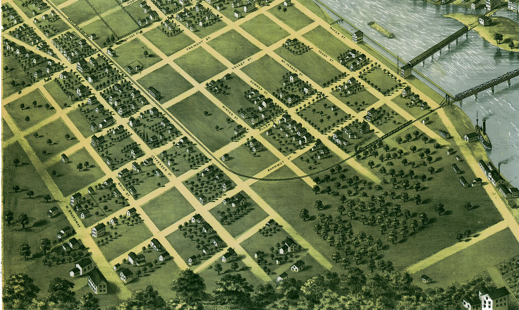 Perspective map is not to scale but gives a good relative representation of the buildings and the streets in the 19th century. Fine detail is remarkable.