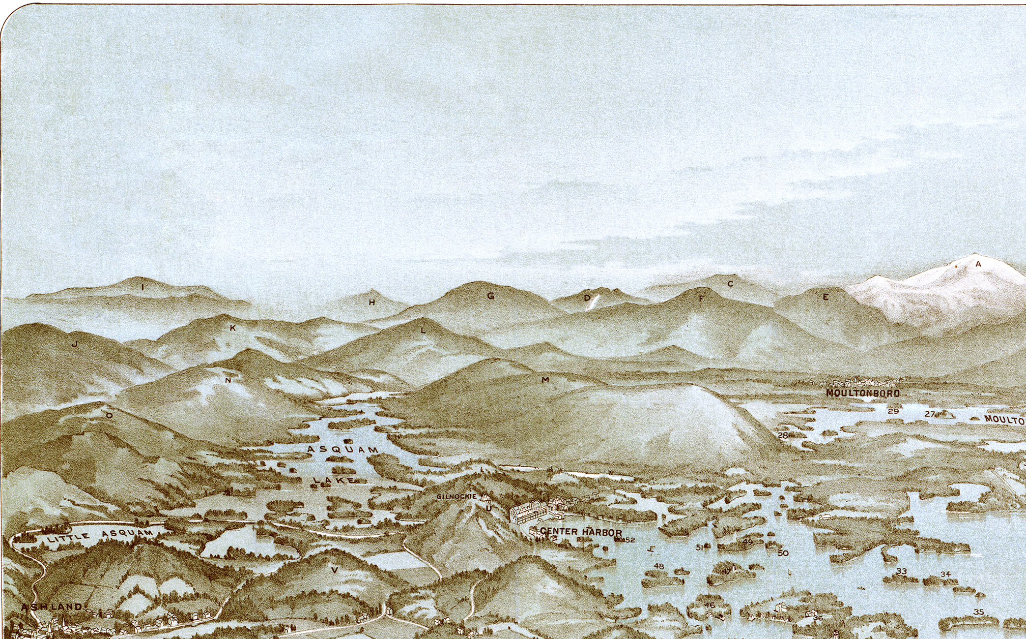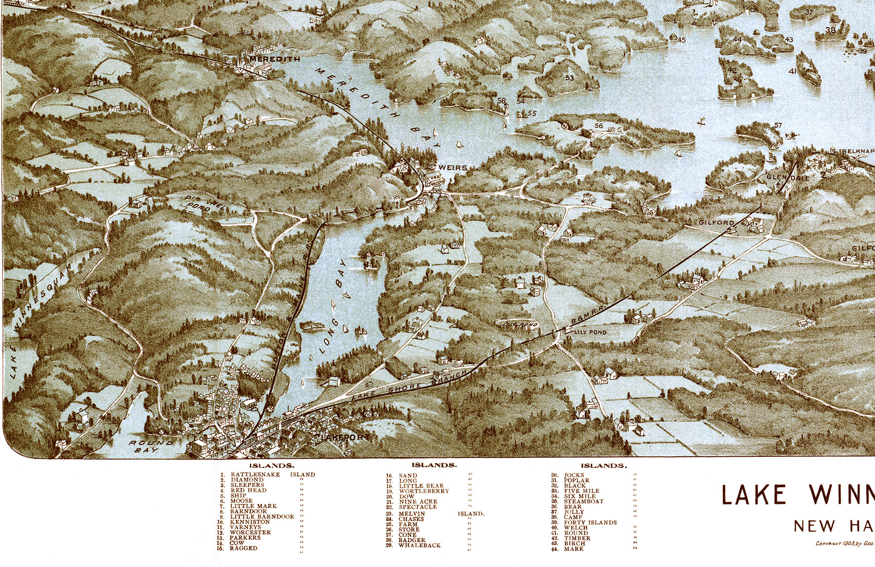 Lake Winnepesaukee, New Hampshire in 1903 - Bird's Eye View, Aerial, Panorama, Vintage, Antique, Fine Art, Wall Map, History