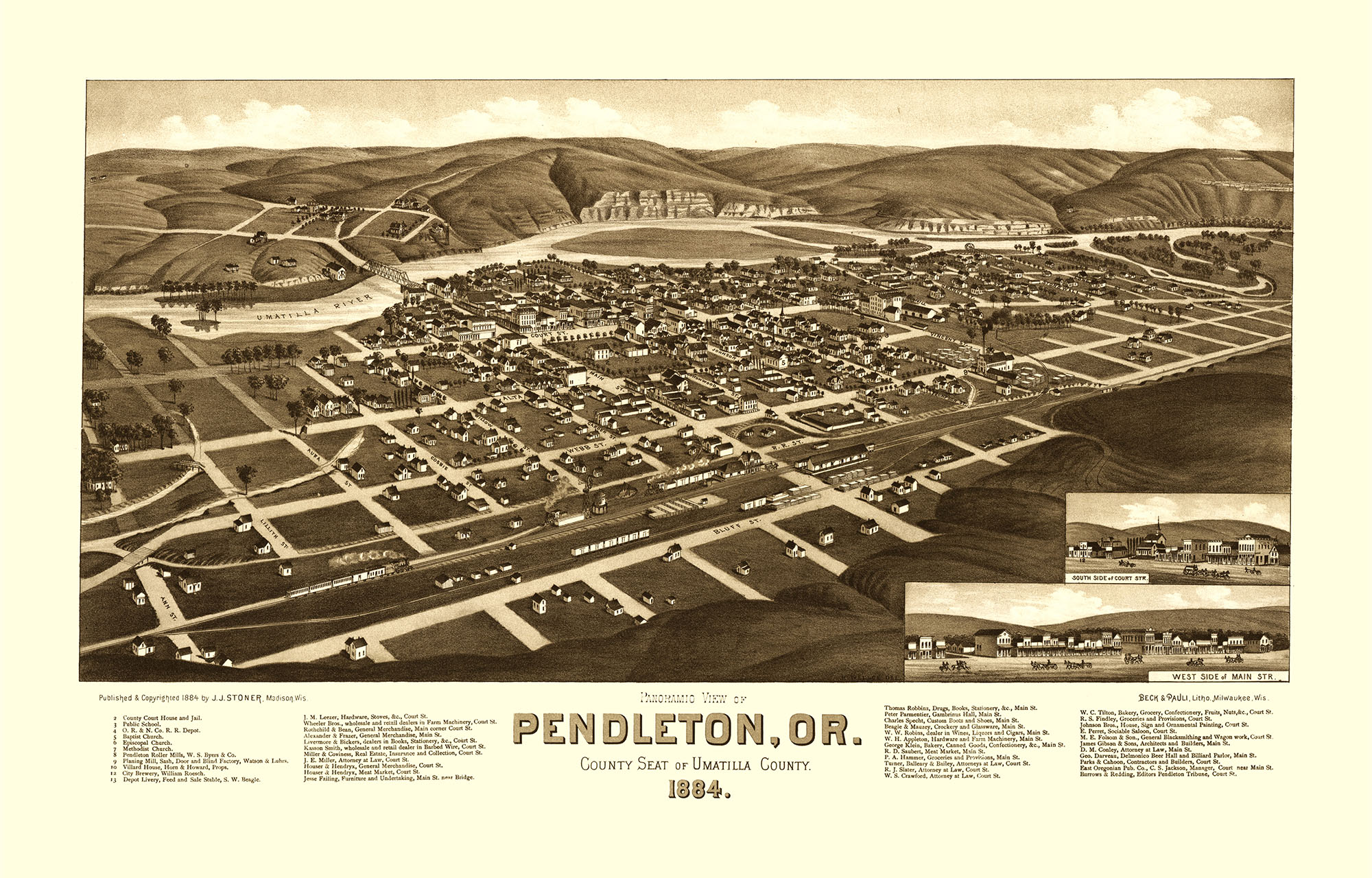 Extremely fine sepia tone reproduction of "Bird's Eye" map of Pendleton, Oregon in 1884. Remarkable detail. Available in a variety of sizes; contact me if you desire a size not listed.