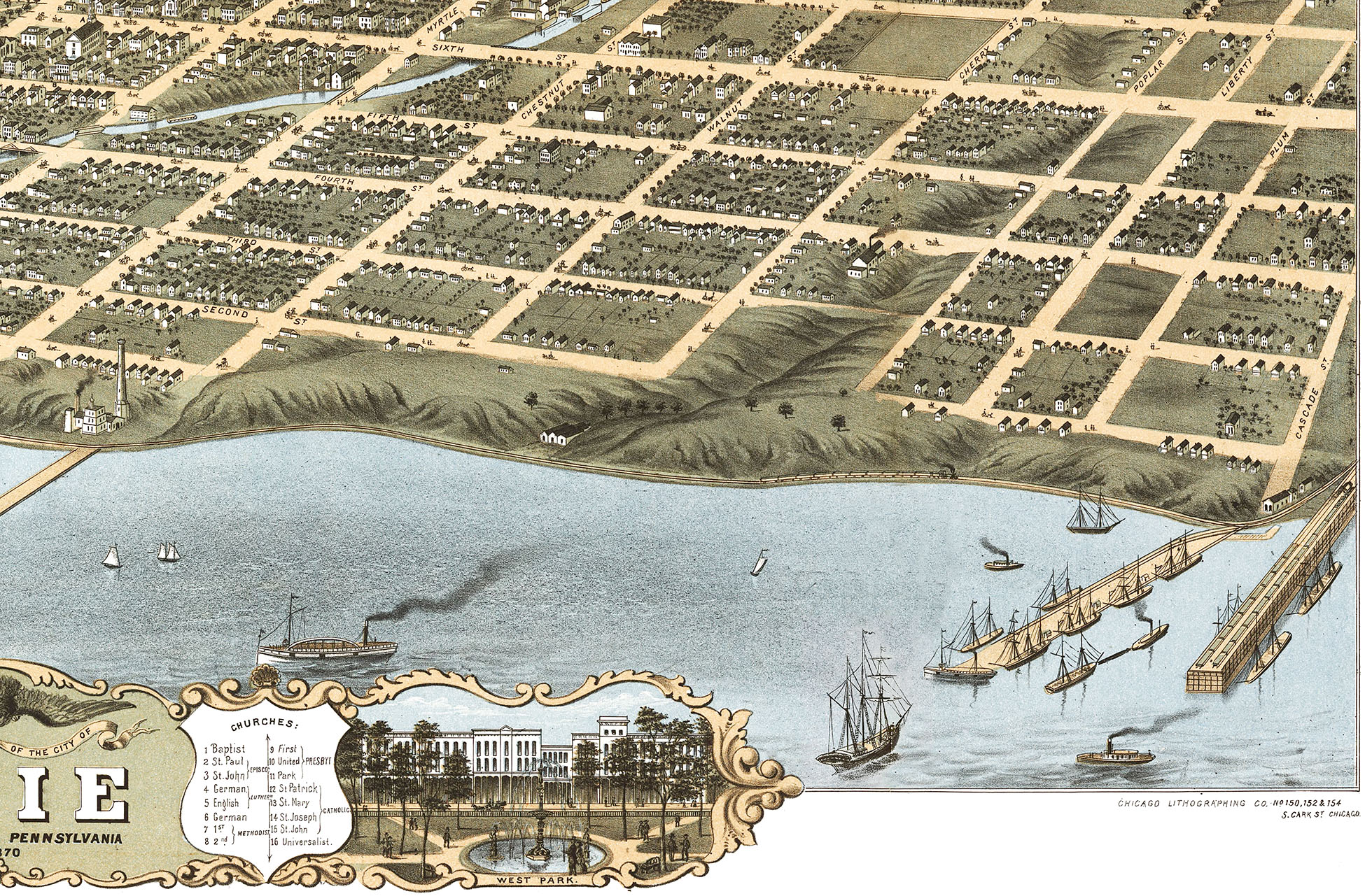 Erie, Pennsylvania in 1870 - Bird's Eye View, Map, Aerial, Panorama, Vintage, Antique, Fine Art, Wall Art, History