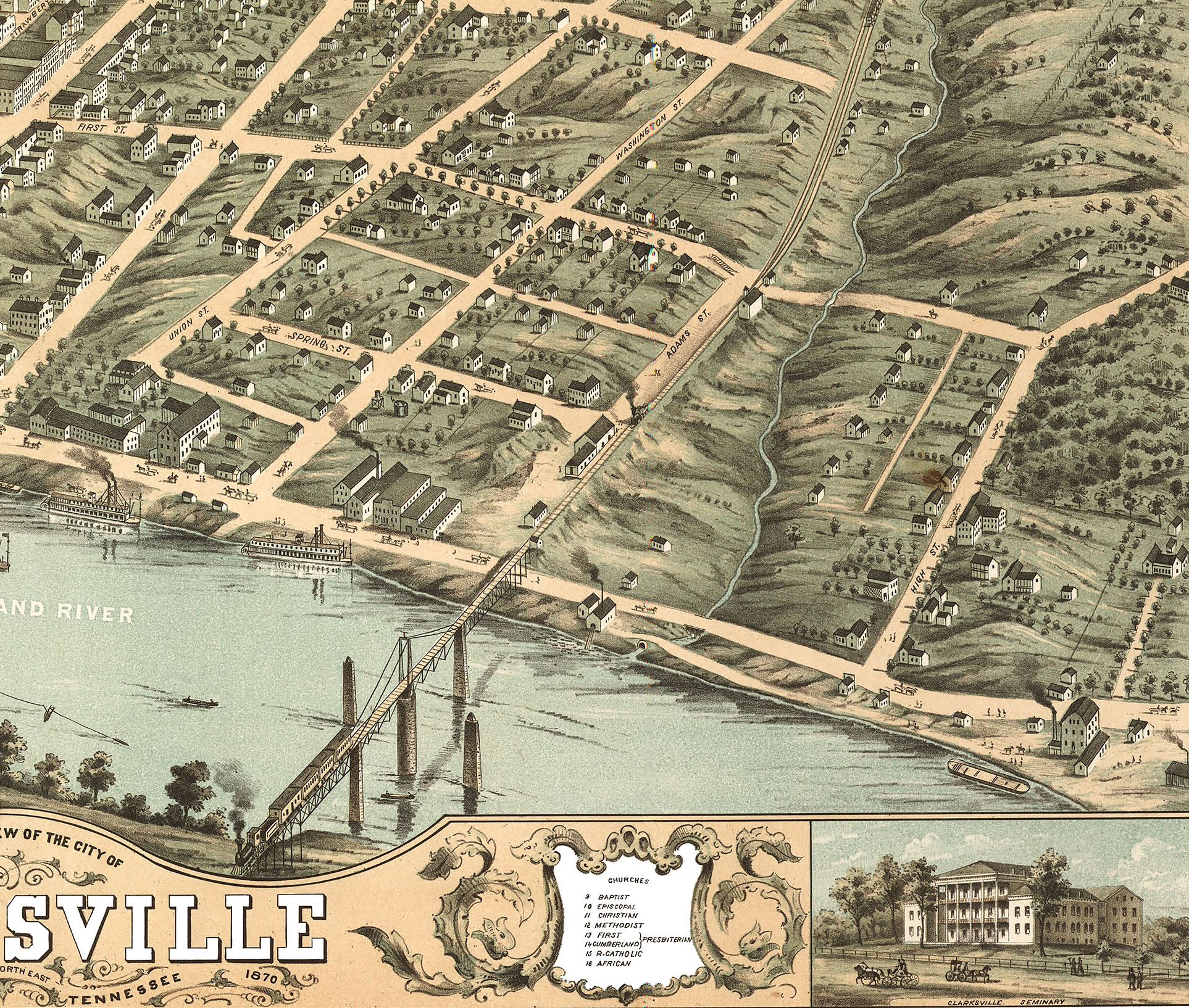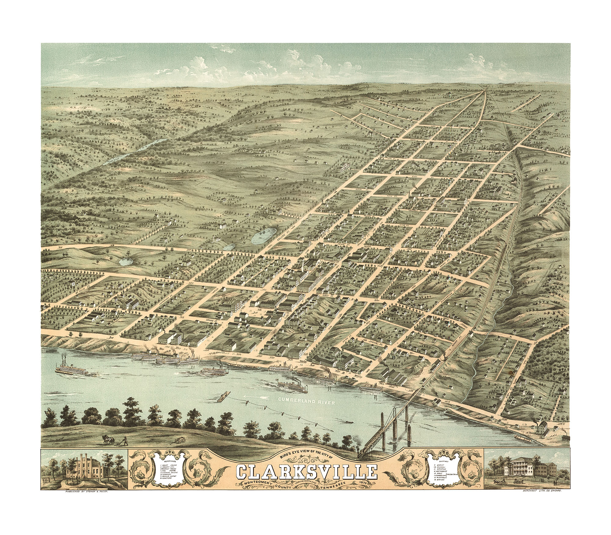 Clarksville, Tennessee in 1870 - Bird's Eye View, Map, Aerial, Panorama, Vintage, Antique, Fine Art, Wall Art, History