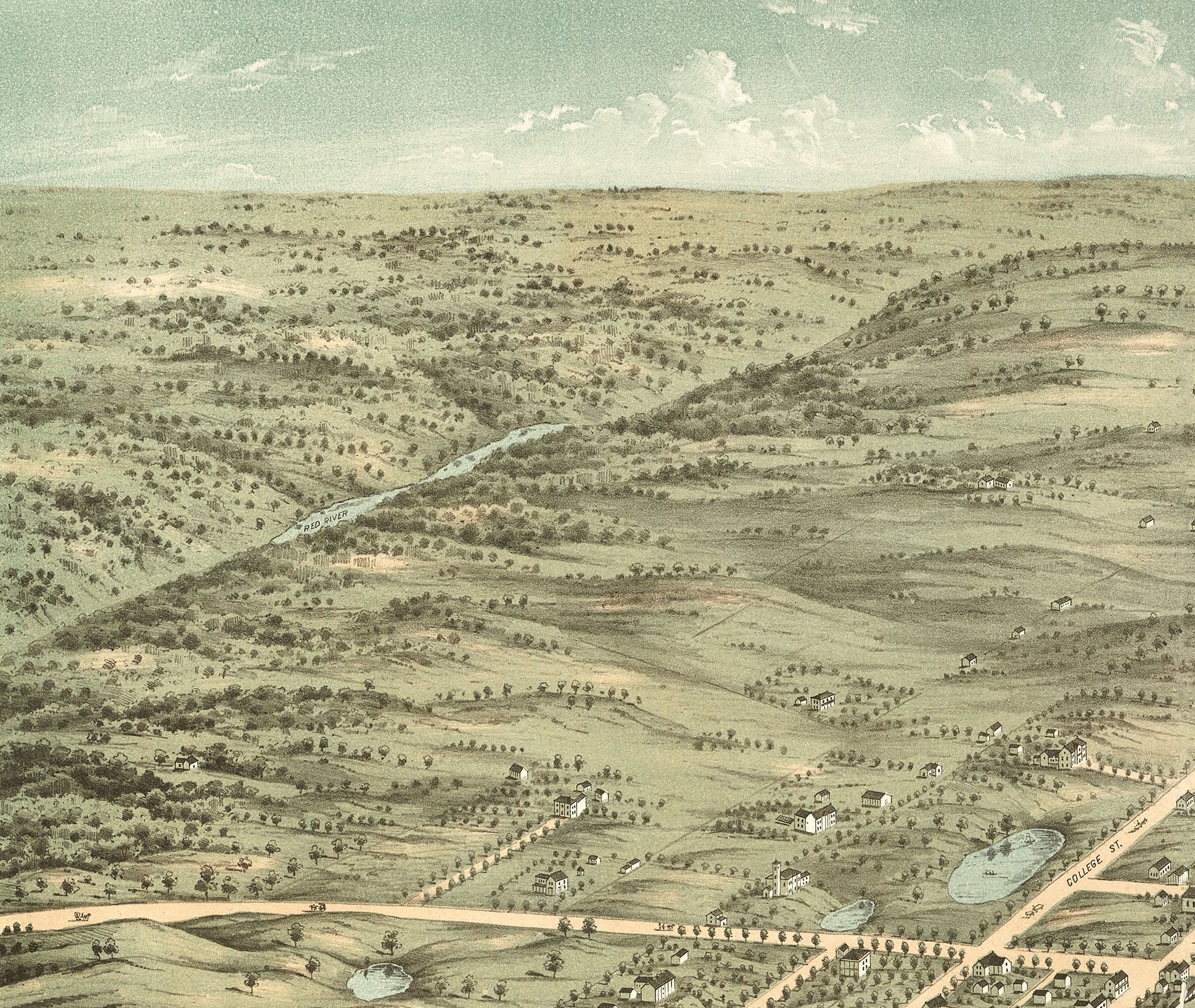 Perspective map is not to scale but gives a good relative representation of the buildings and the streets in the late 19th century. Fine detail is remarkable. Your print will not have the "OldMapsOfThe1800s" watermark.