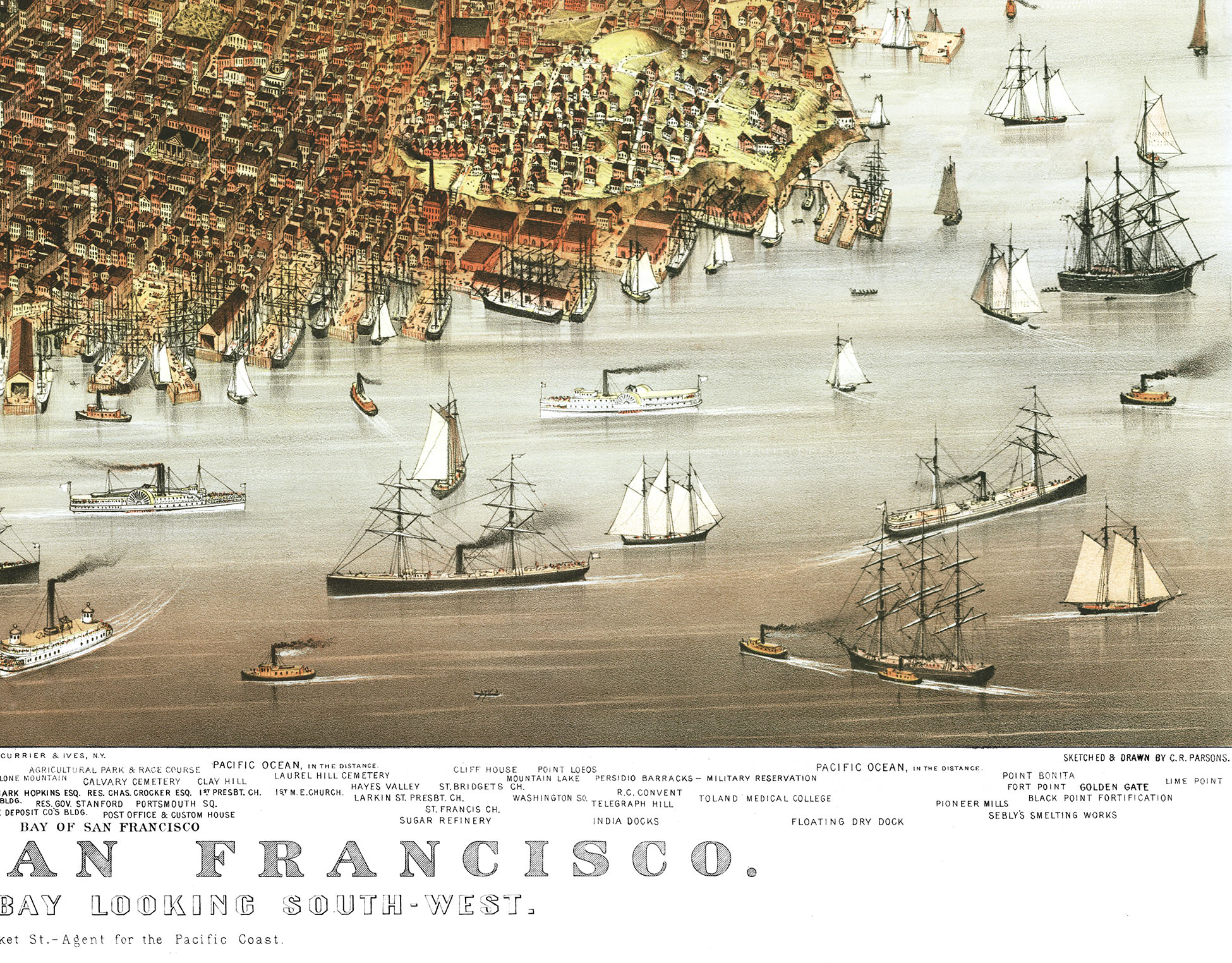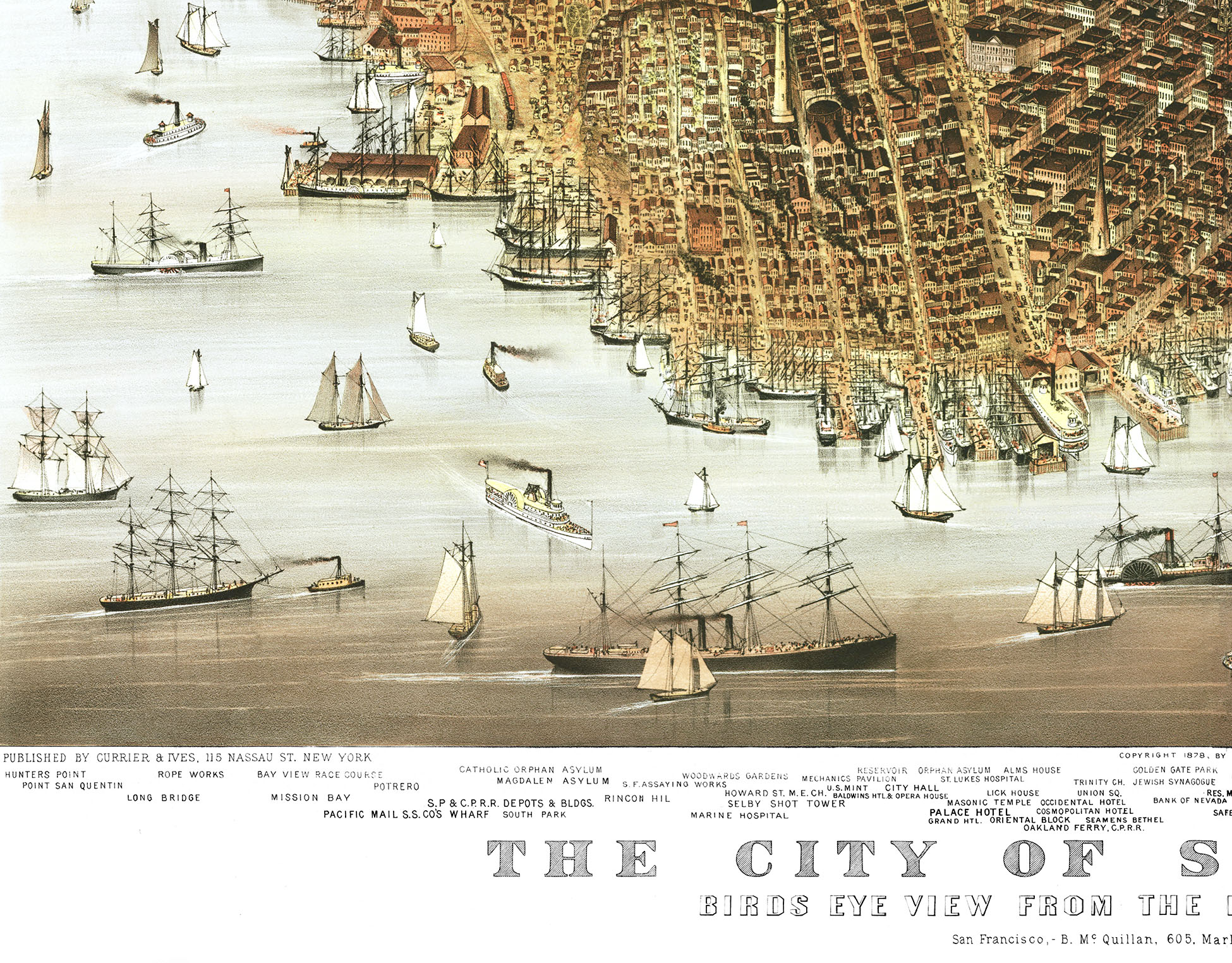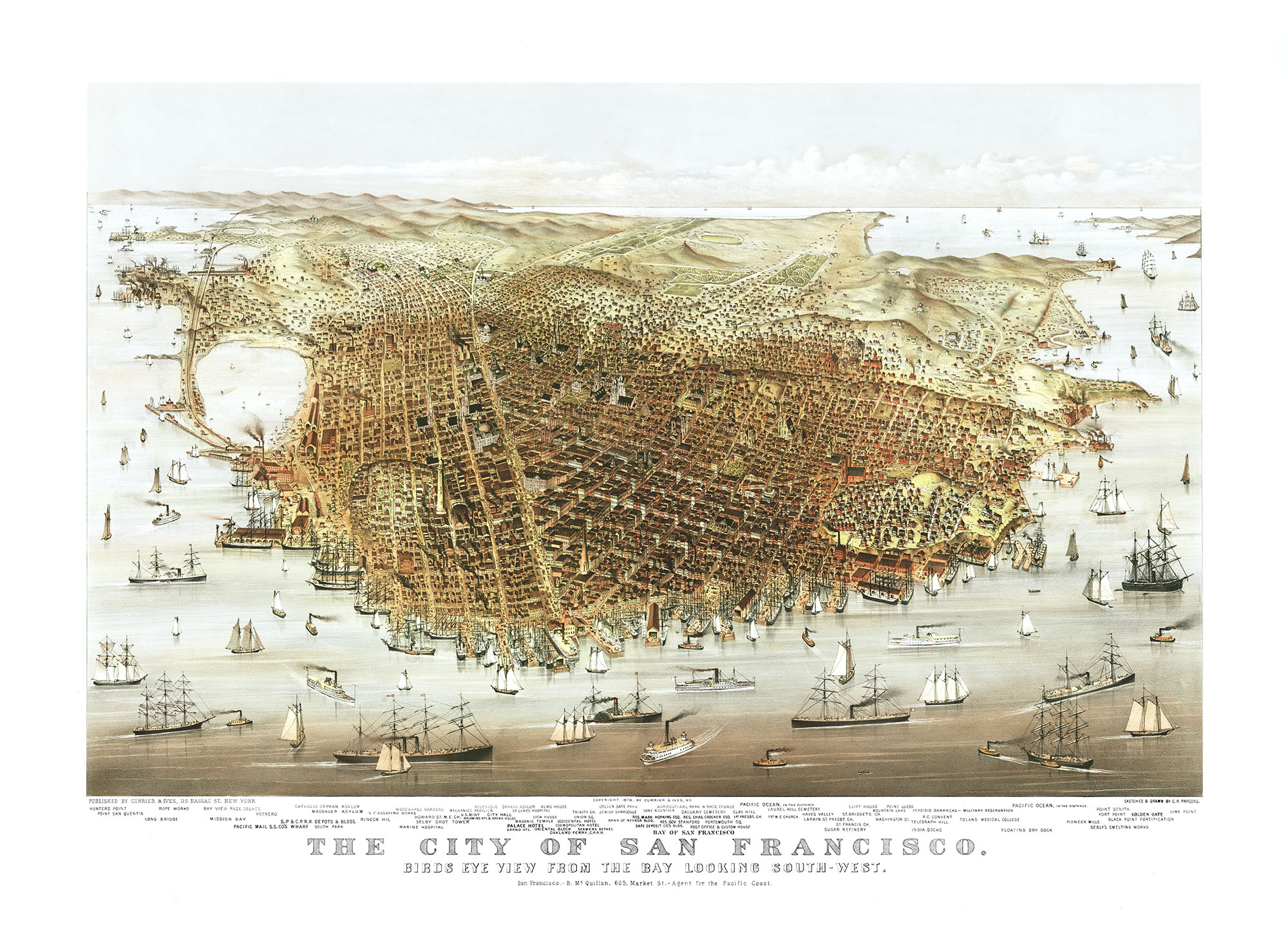 Perspective map is not to scale but gives a good relative representation of the buildings and the streets in San Francisco in the late 19th century. Fine detail is remarkable.