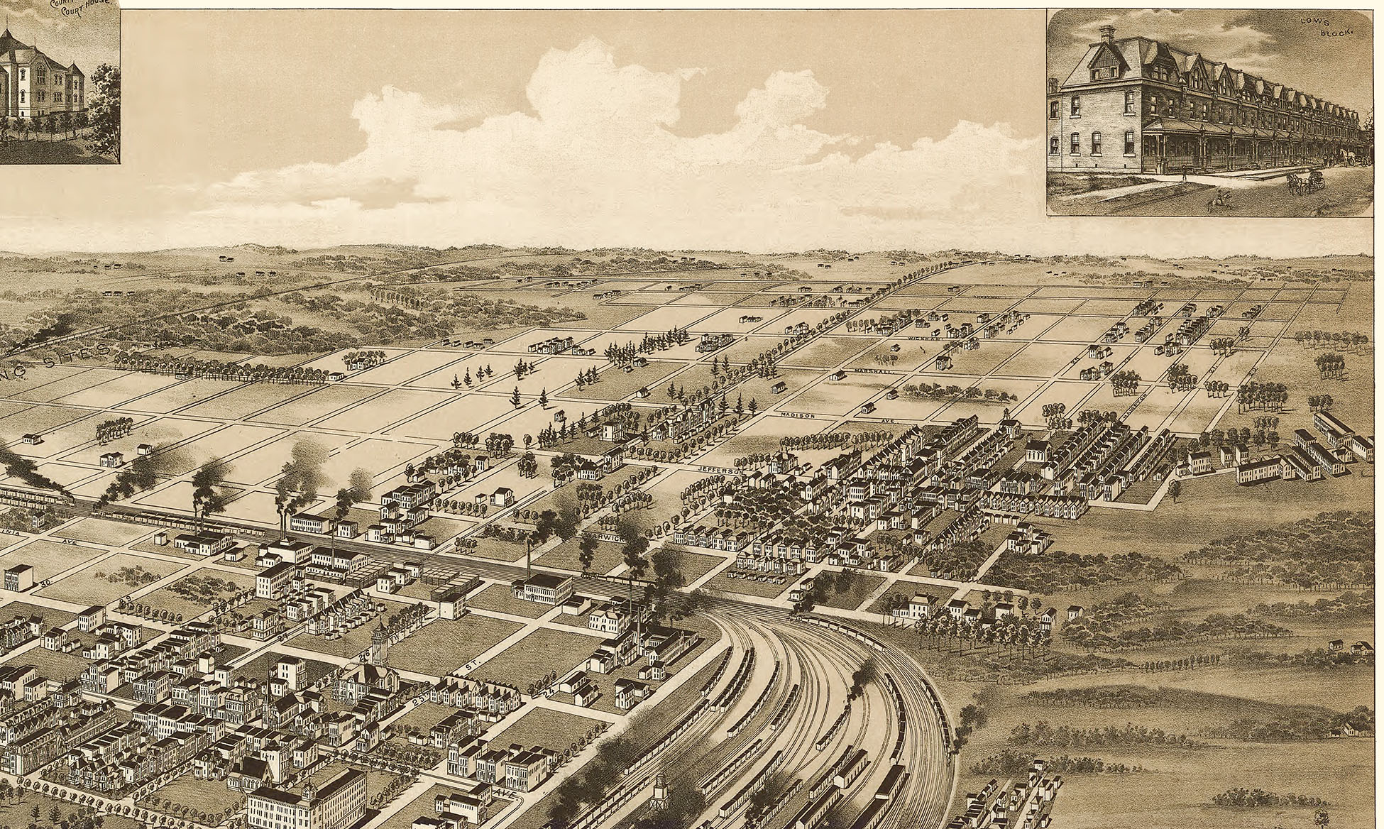 Perspective map is not to scale but gives a good relative representation of the buildings and the streets in the late 19th century. Fine detail is remarkable.