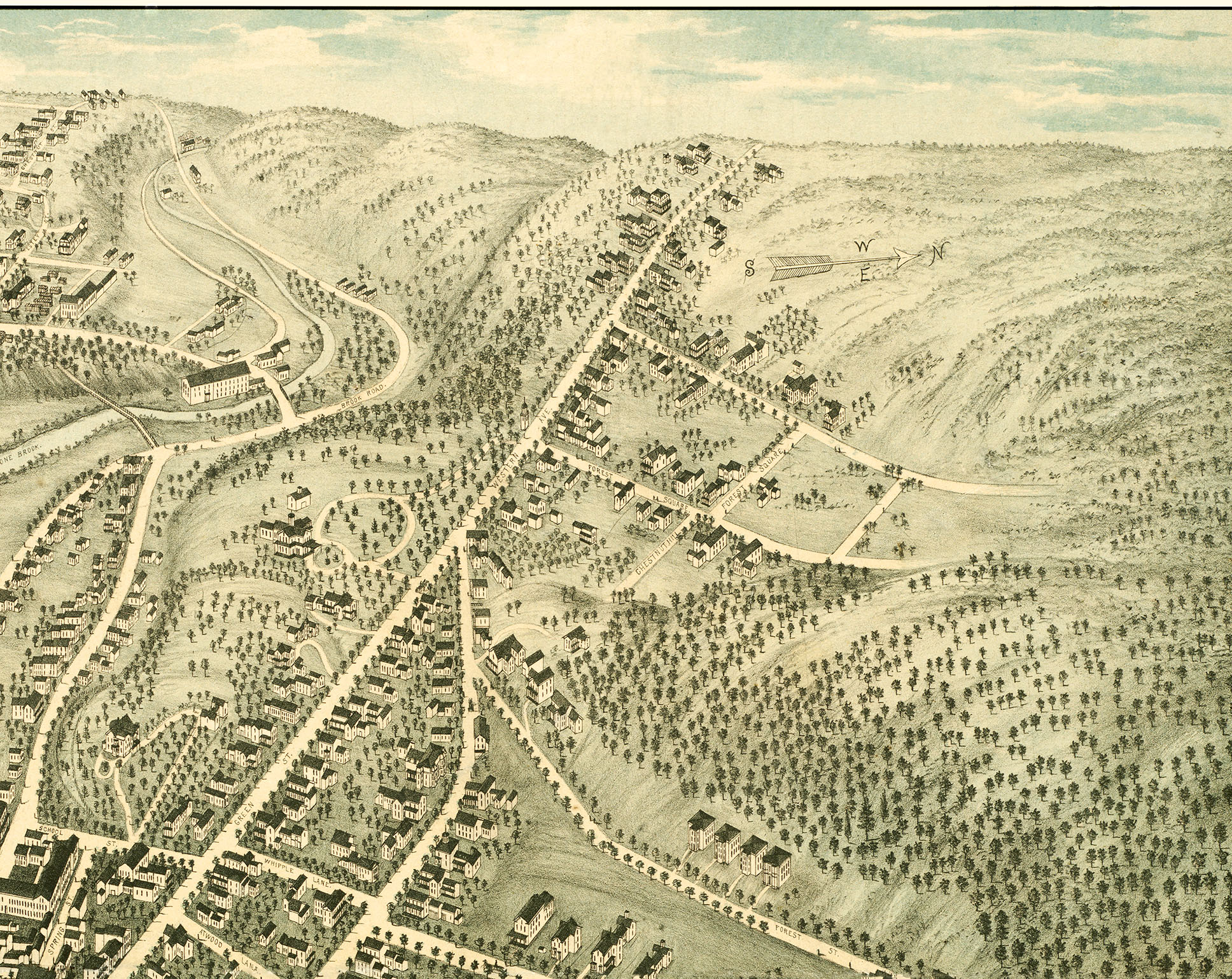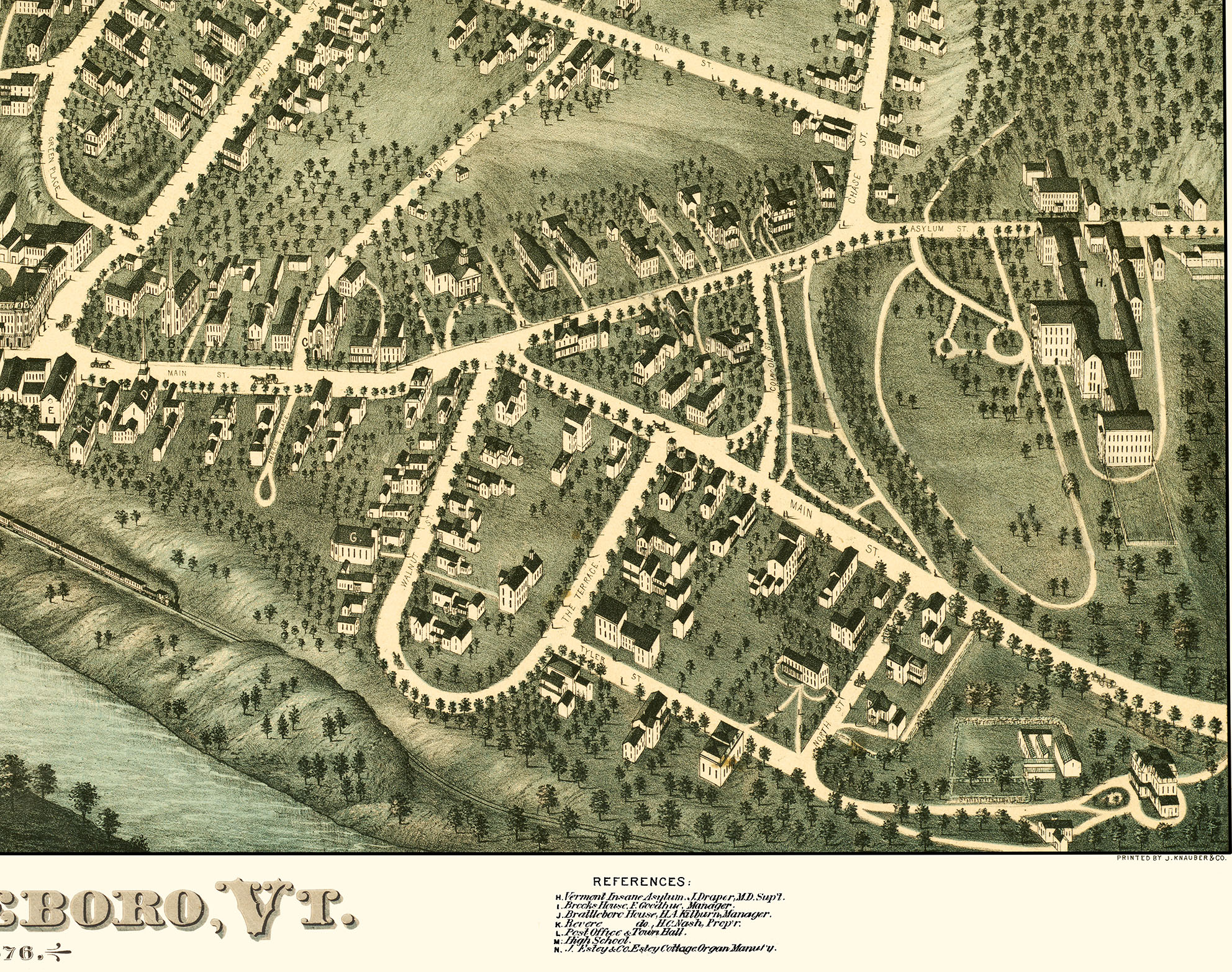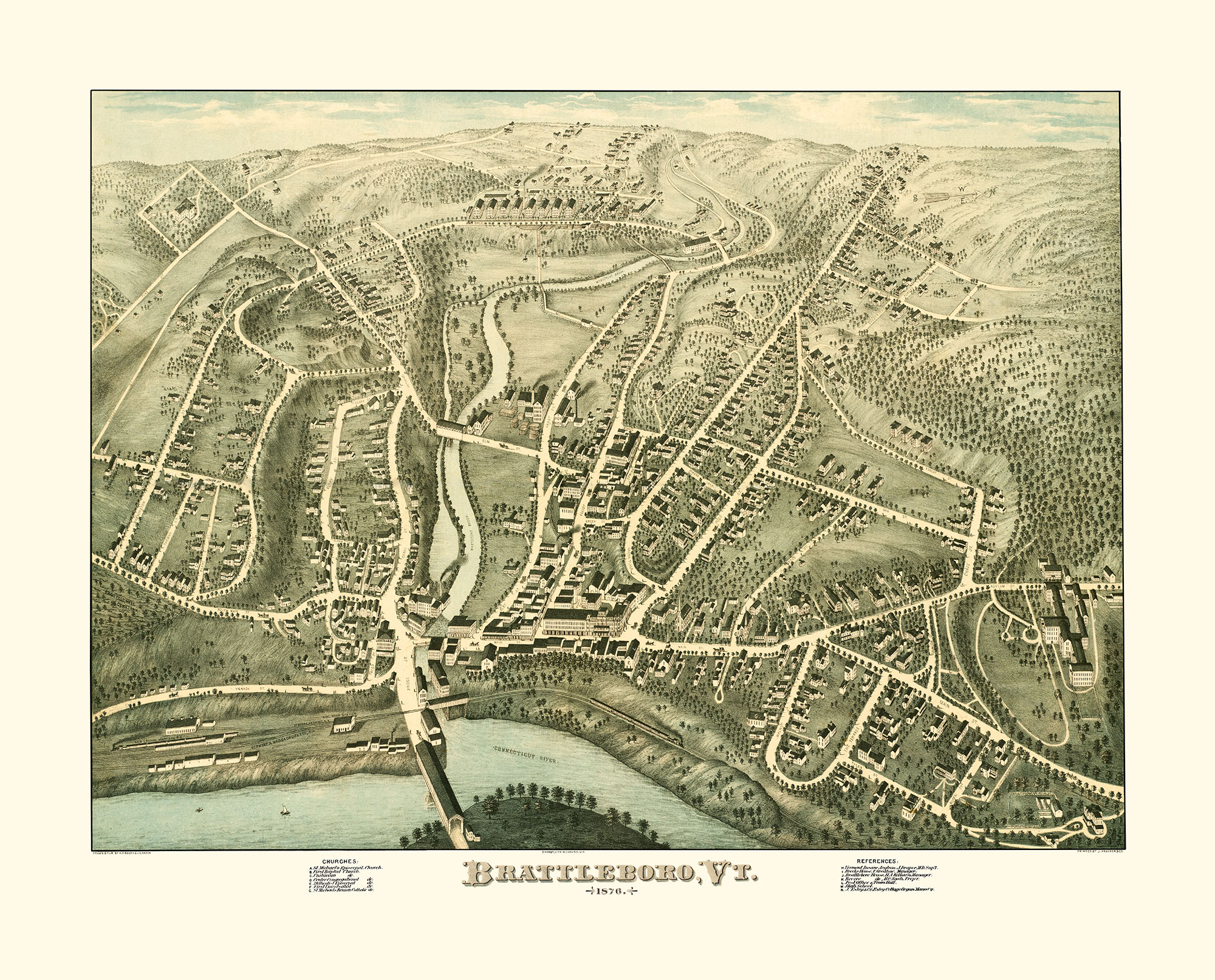 Brattleboro, Vermont in 1876 - Bird's Eye View, Aerial map, Panorama, Vintage, Antique map, Reproduction, Giclée, Framable map, Fine Art