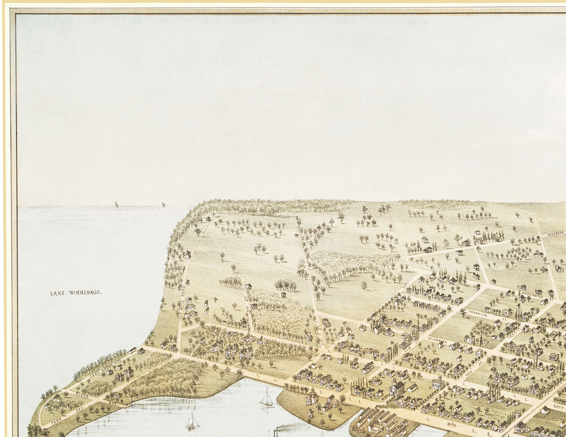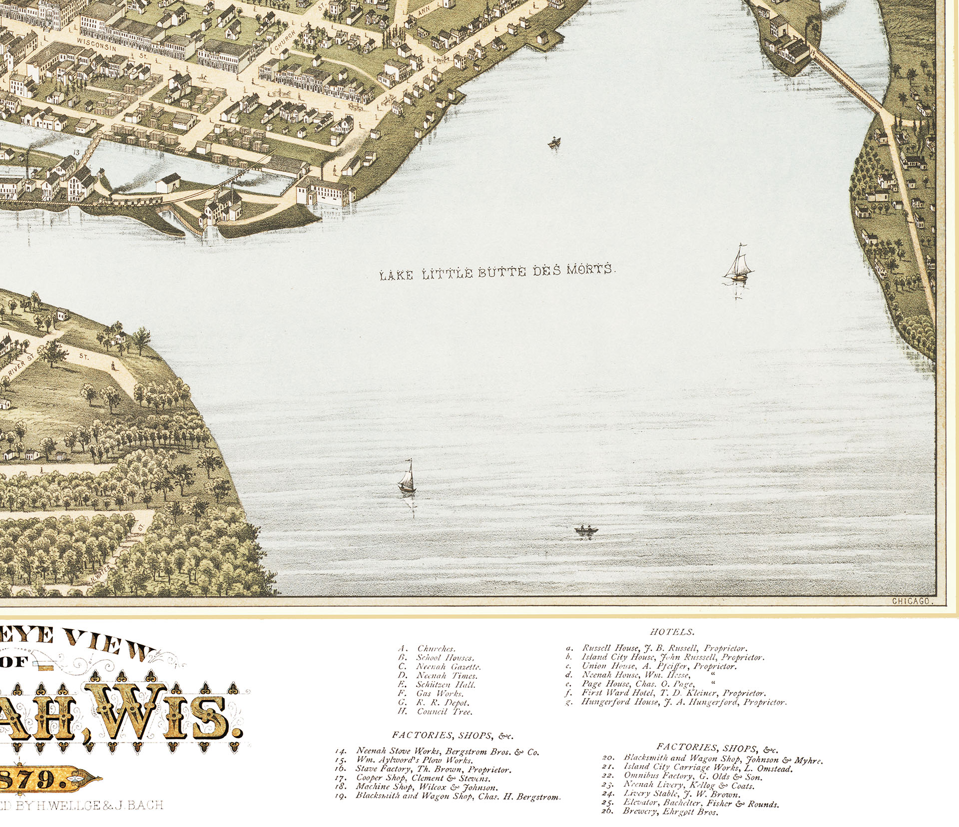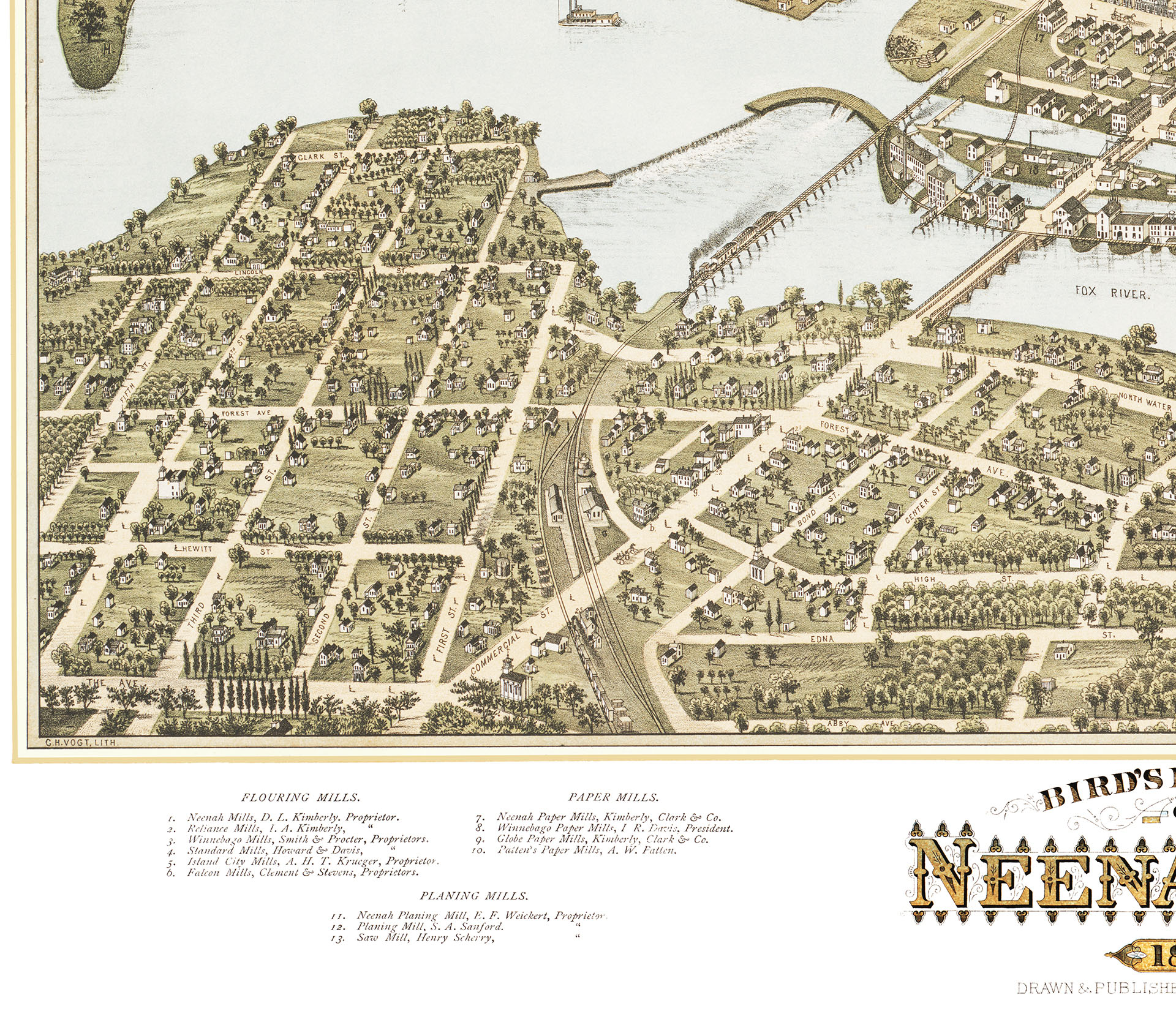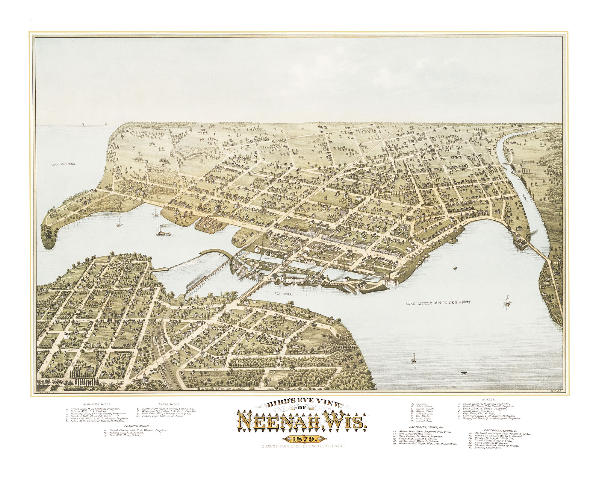 Neenah, Wisconsin in 1879- Bird's Eye View Map, Aerial, Panorama, Vintage, Antique, Reproduction, Giclée, Fine Art, Wall Art, History