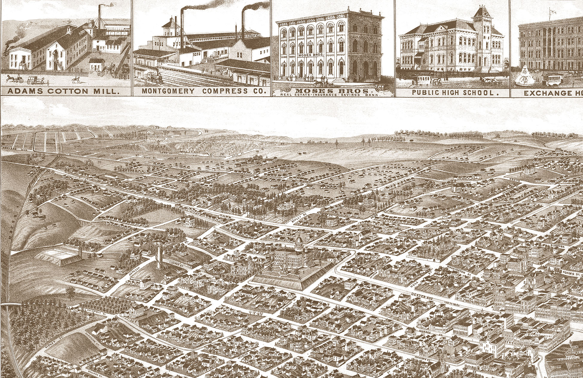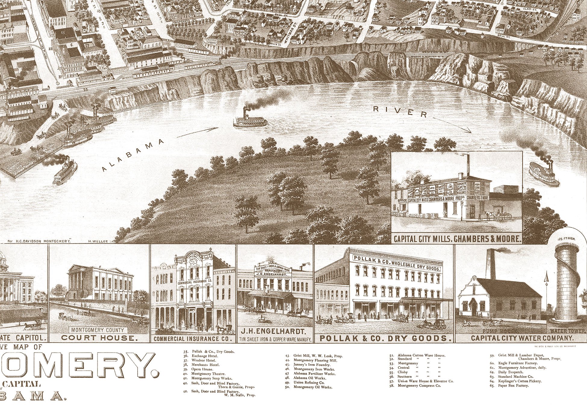 Montgomery, Alabama in 1887 - Bird's Eye View Map, Aerial, Panorama, Vintage, Antique, Reproduction, Giclée, Fine Art, Wall Map, History