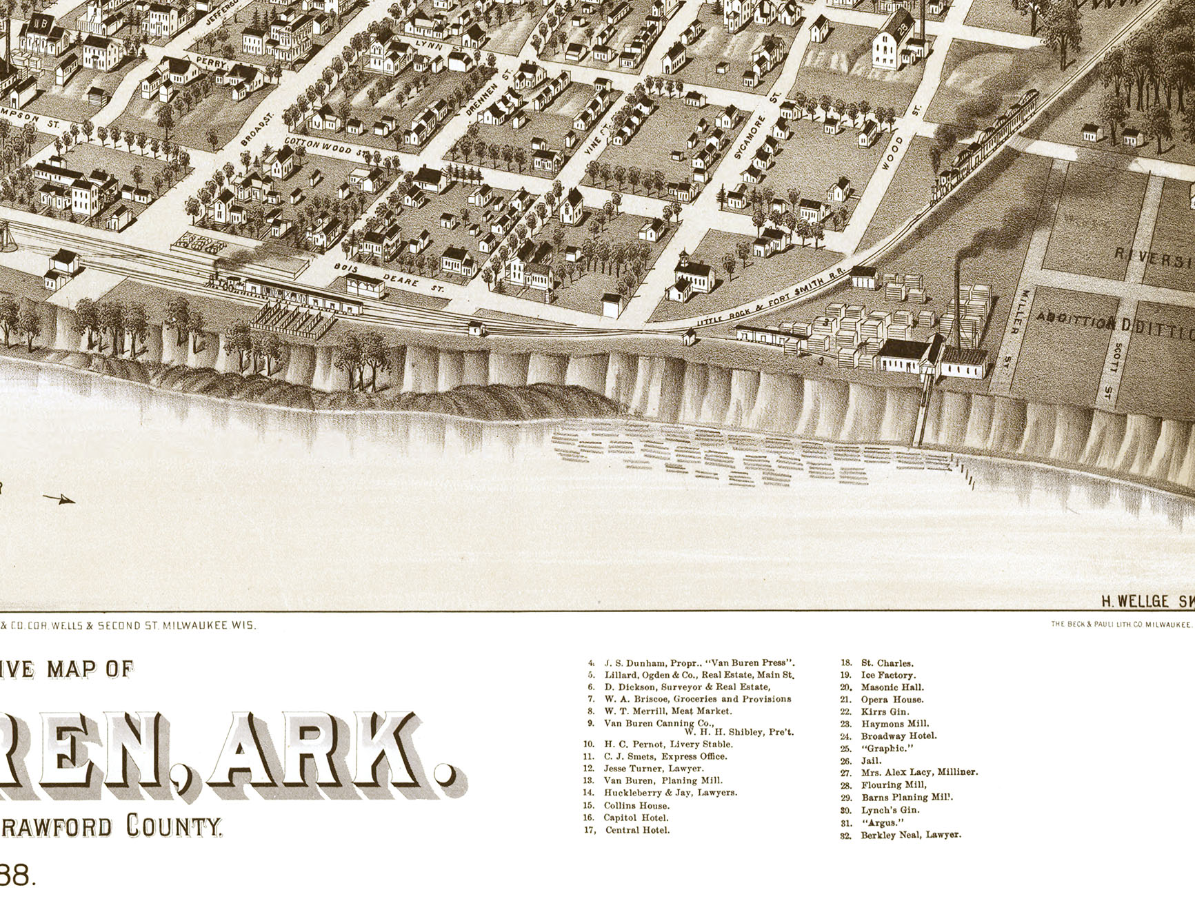 Van Buren, Arkansas in 1888 - Bird's Eye View Map, Aerial map, Panorama, Vintage map, Antique map, Reproduction, Giclée, Wall map, Fine Art