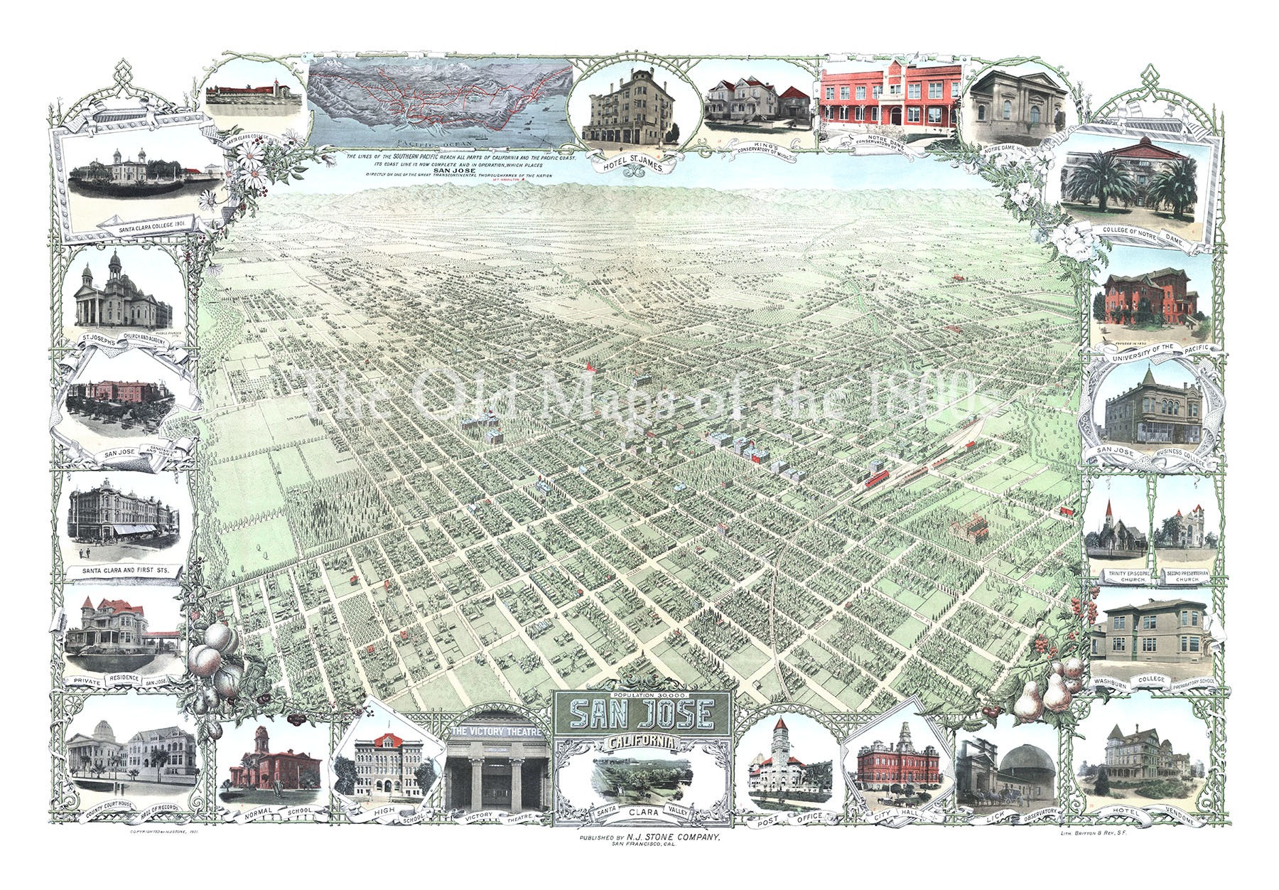 San Jose, California in 1901 - Bird's Eye View, Map, Aerial, Panorama, Vintage, Antique, Fine Art, Wall Art, History