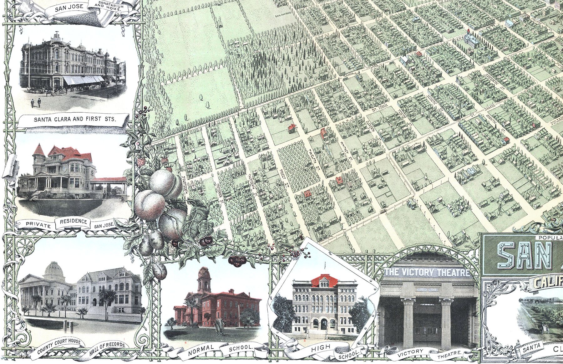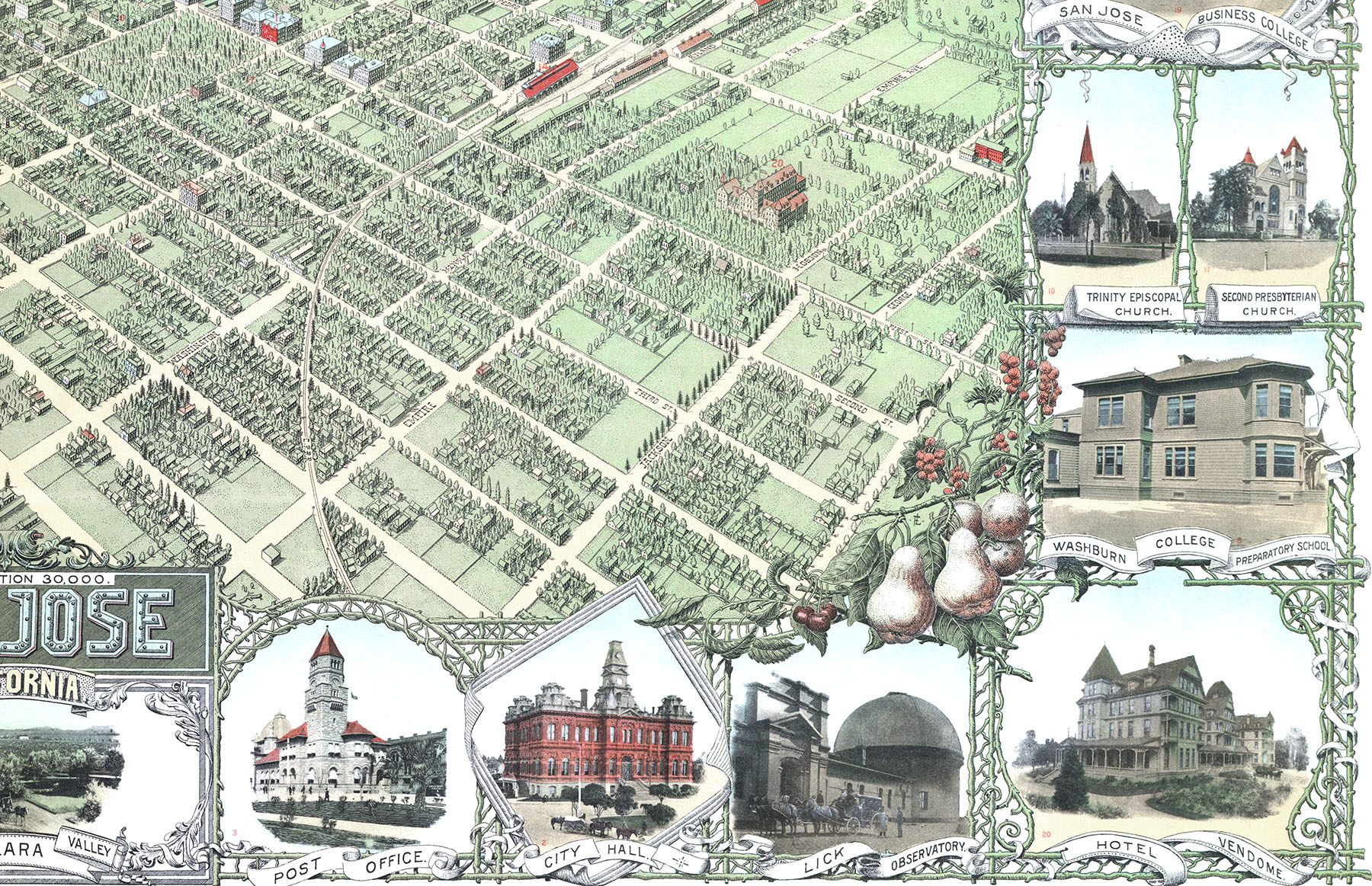 Brilliant, full color, fine art map of San Jose, California in 1901, with special illustrations along the all four borders.