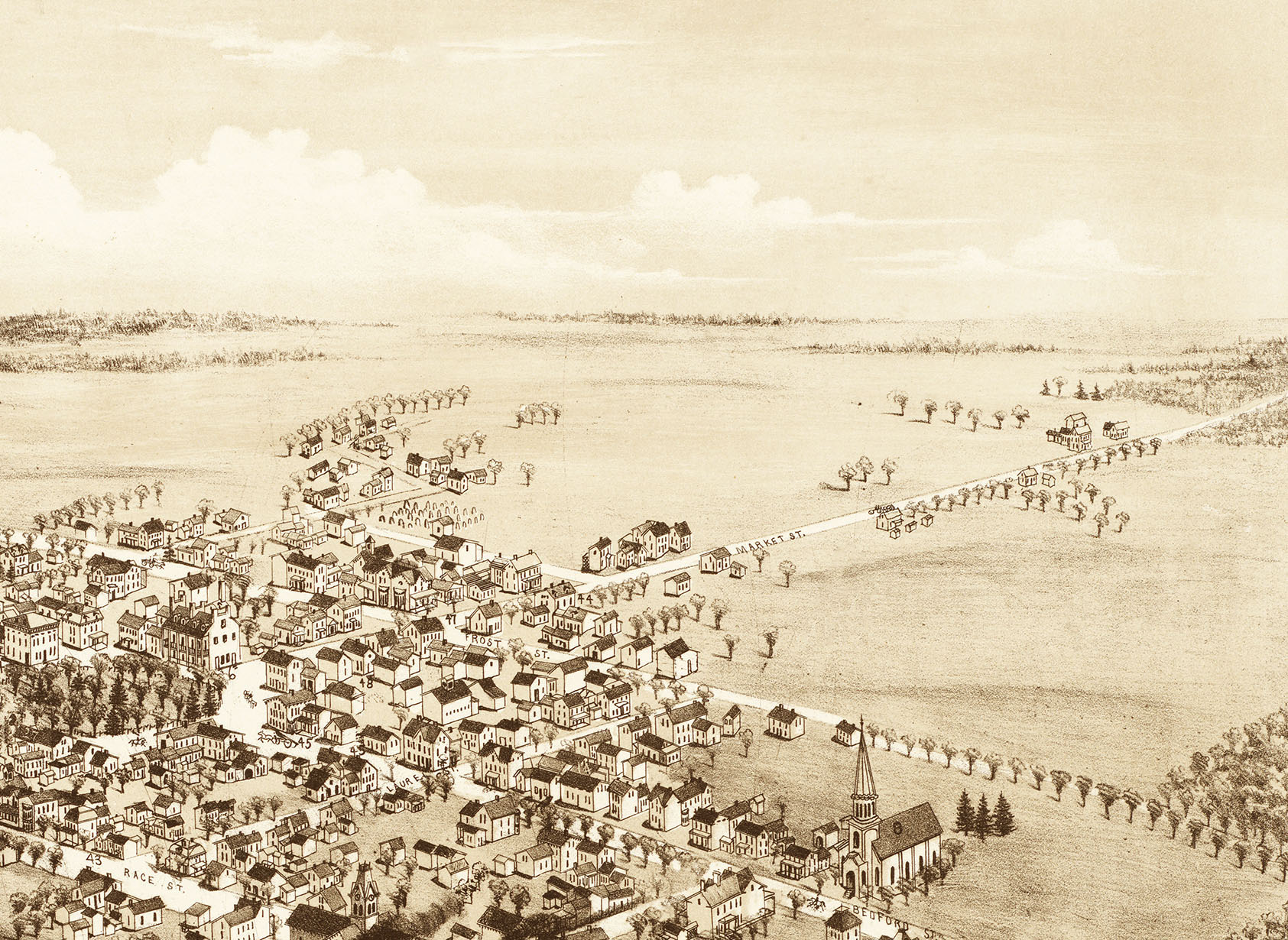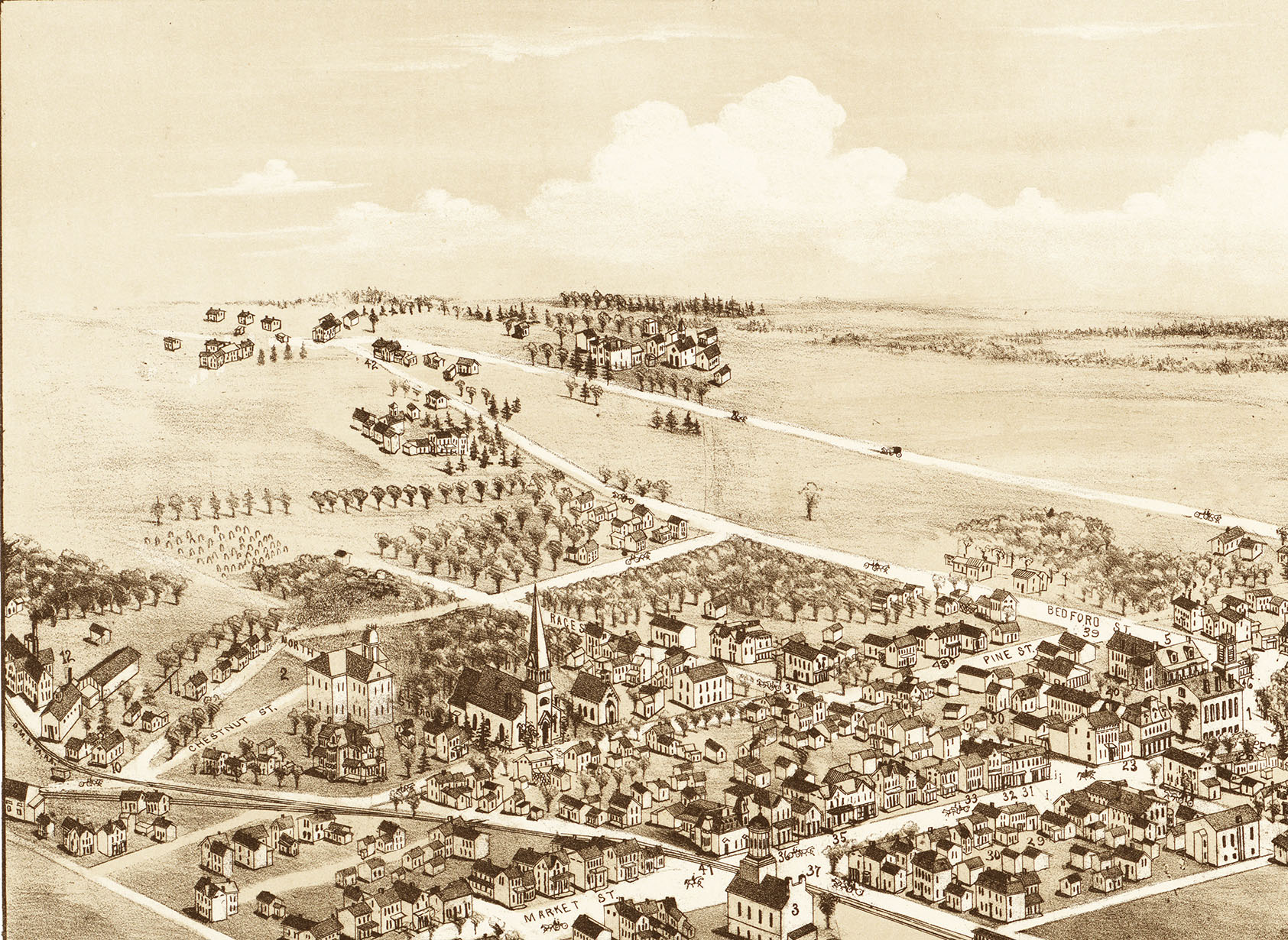 Perspective map is not to scale, but gives a good representation of the buildings and streets in the late 19th century.