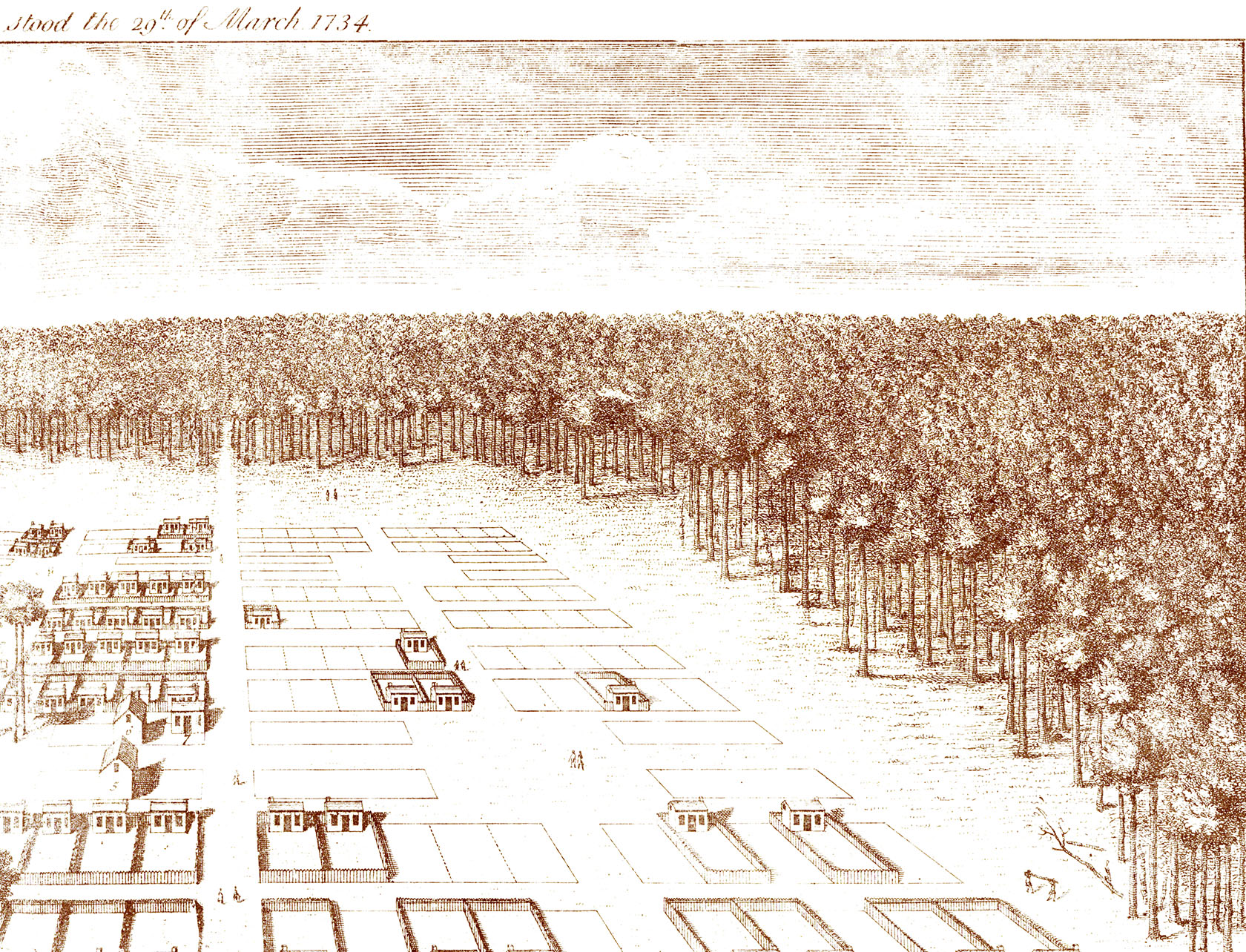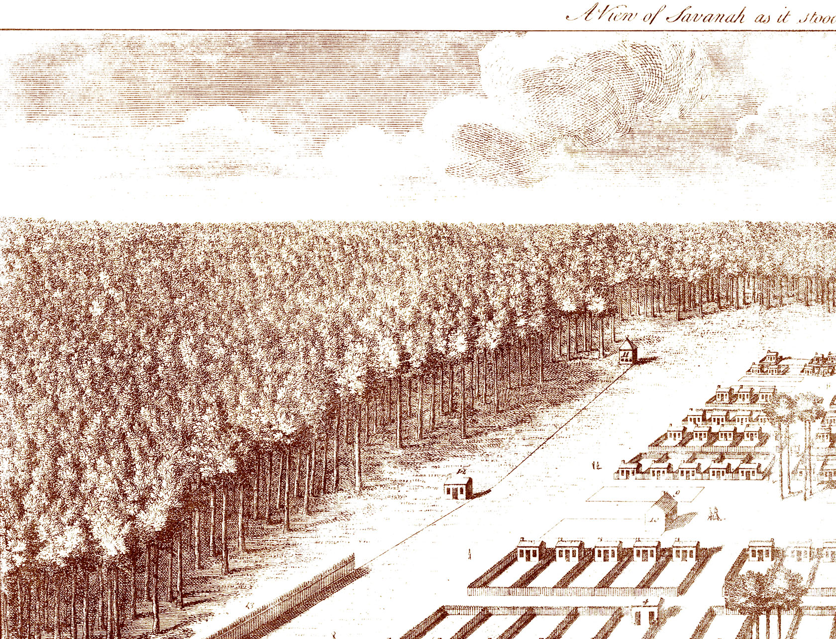 Sepia toned bird's eye view map of Savannah, Georgia from 1734.