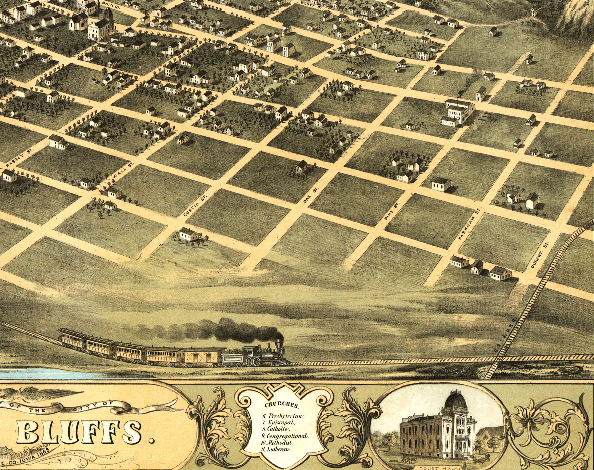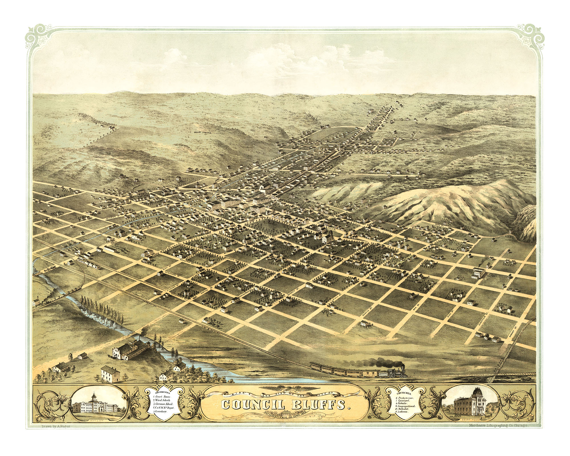 Council Bluffs, Iowa in 1868 - Bird's Eye View, Aerial map, Panorama, Vintage, Antique, Reproduction, Giclée, Fine Art, Wall Art, History