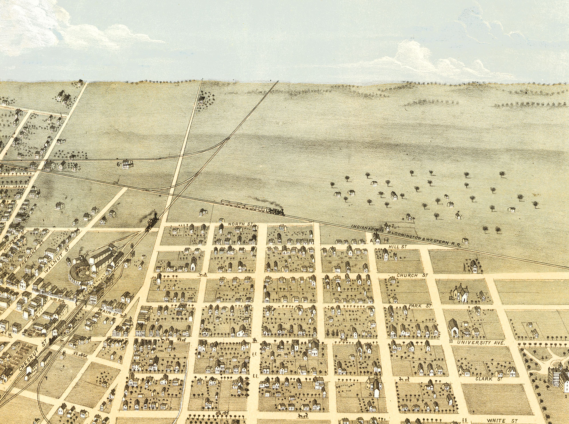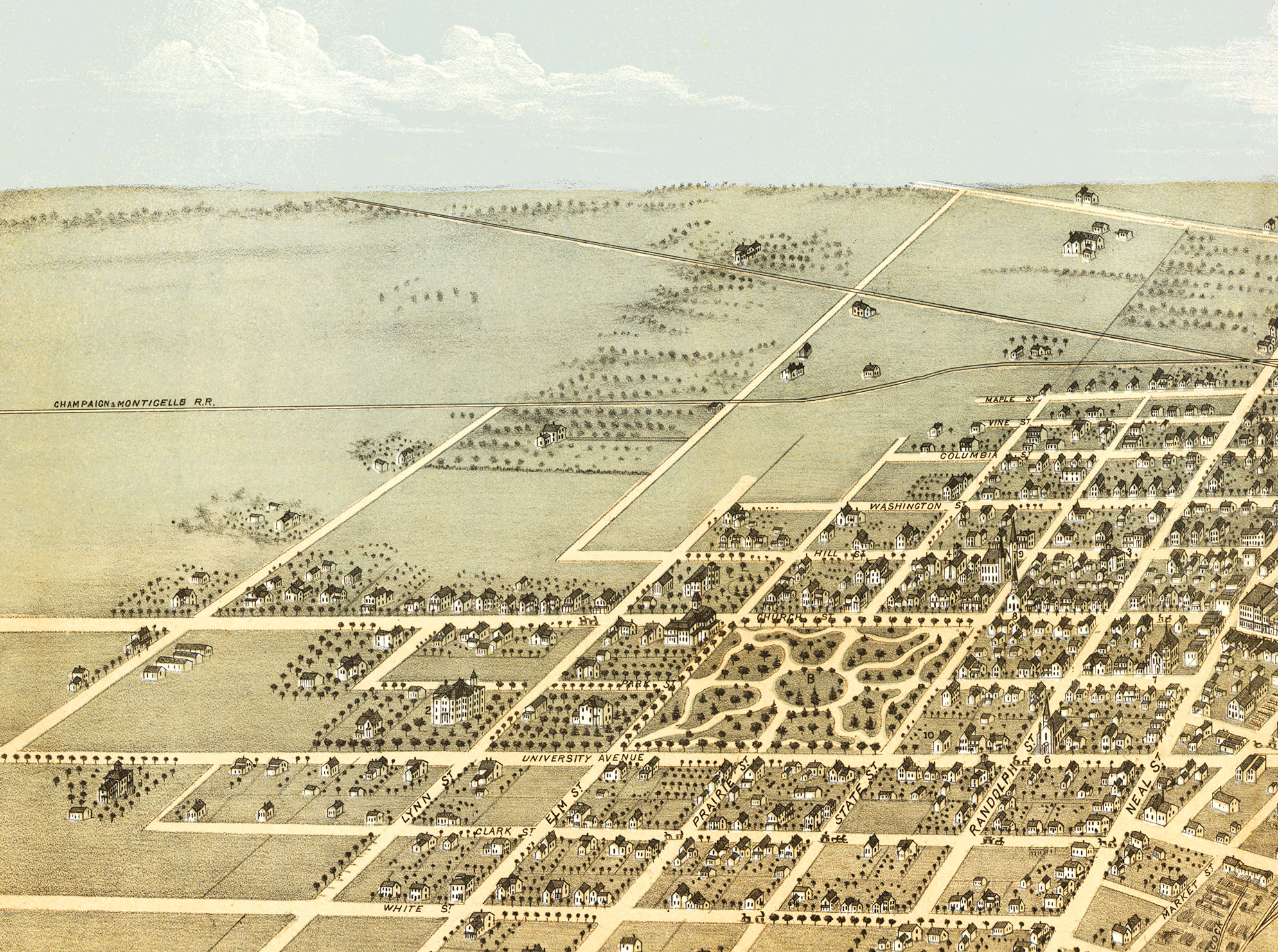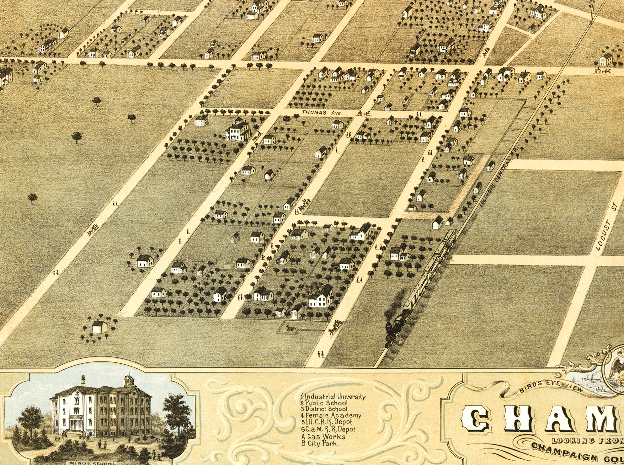 Champaign, Illinois in 1869 - Bird's Eye View, Map, Aerial, Panorama, Vintage, Antique, Reproduction, Giclée, Fine Art, Wall Art, History