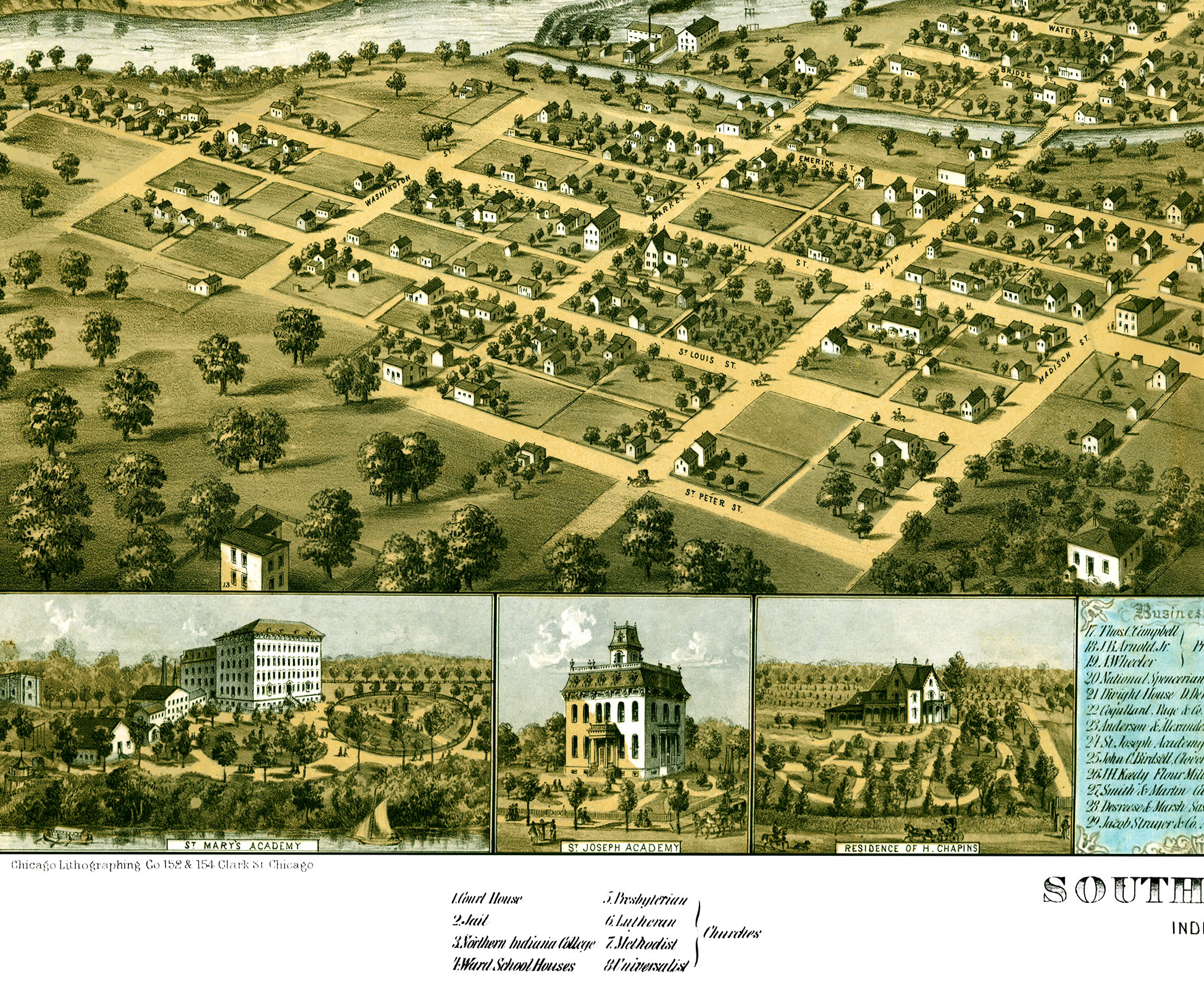 Extremely fine full color reproduction of "Bird's Eye" map of South Bend, Indiana in 1866. Vibrant colors, remarkable detail. Available in a variety of sizes; contact me if you desire a size not listed.