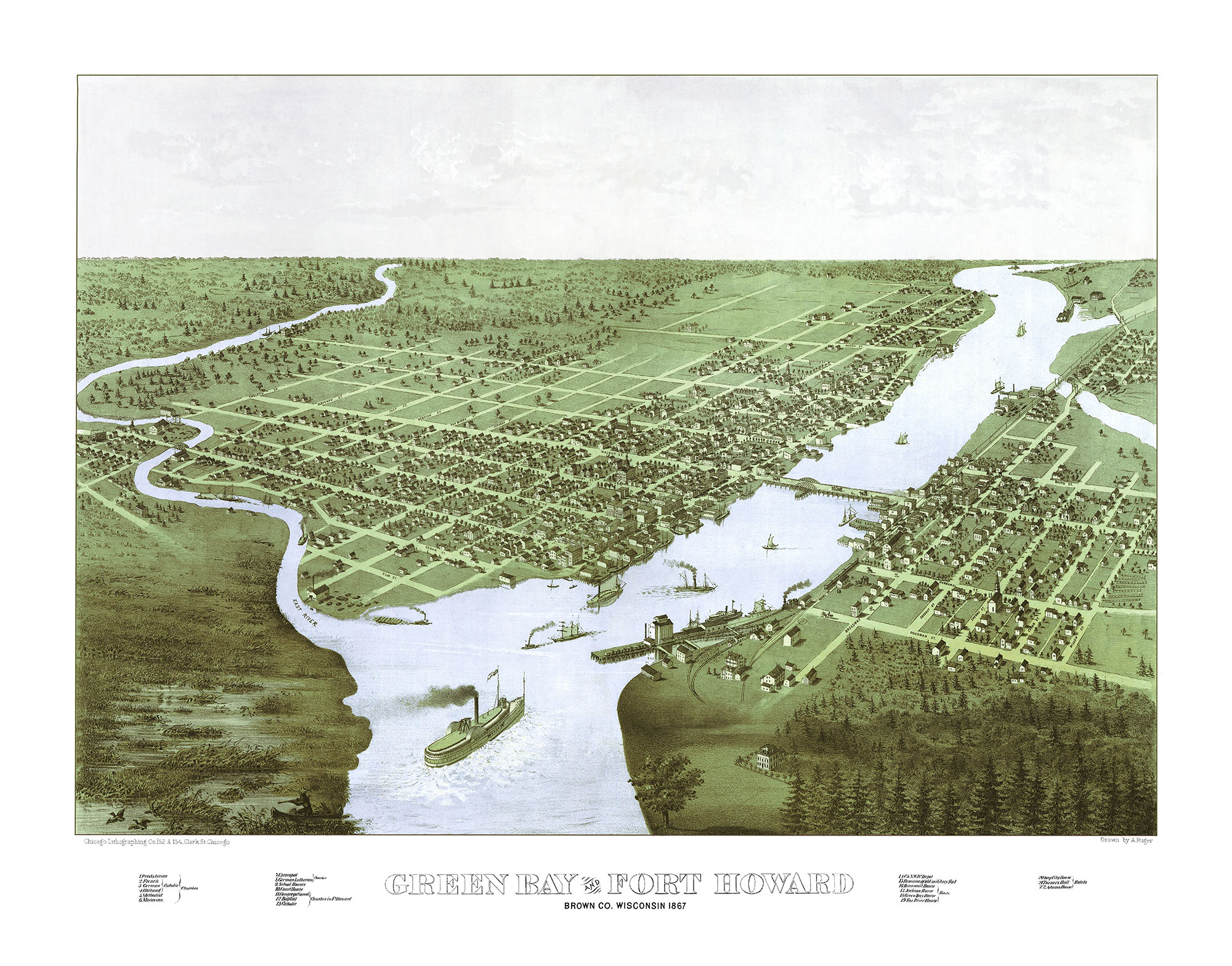Green Bay and Fort Howard, Wisconsin in 1867 - Bird's Eye View Map, Aerial, Panorama, Vintage, Antique, Reproduction, Fine Art, Wall Art