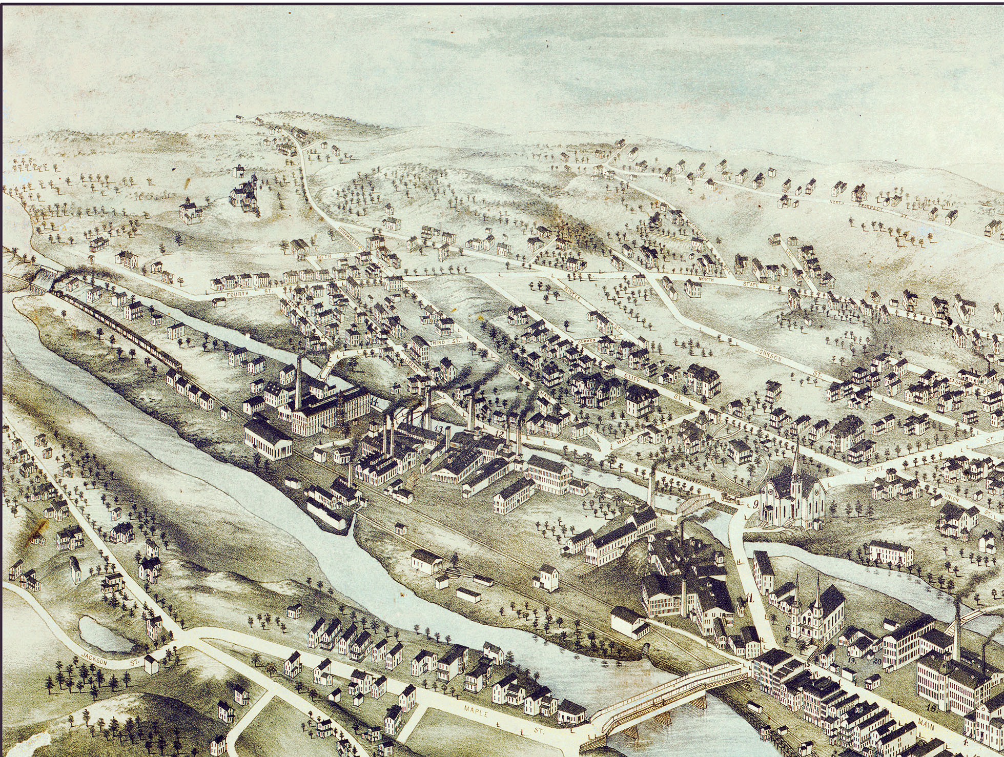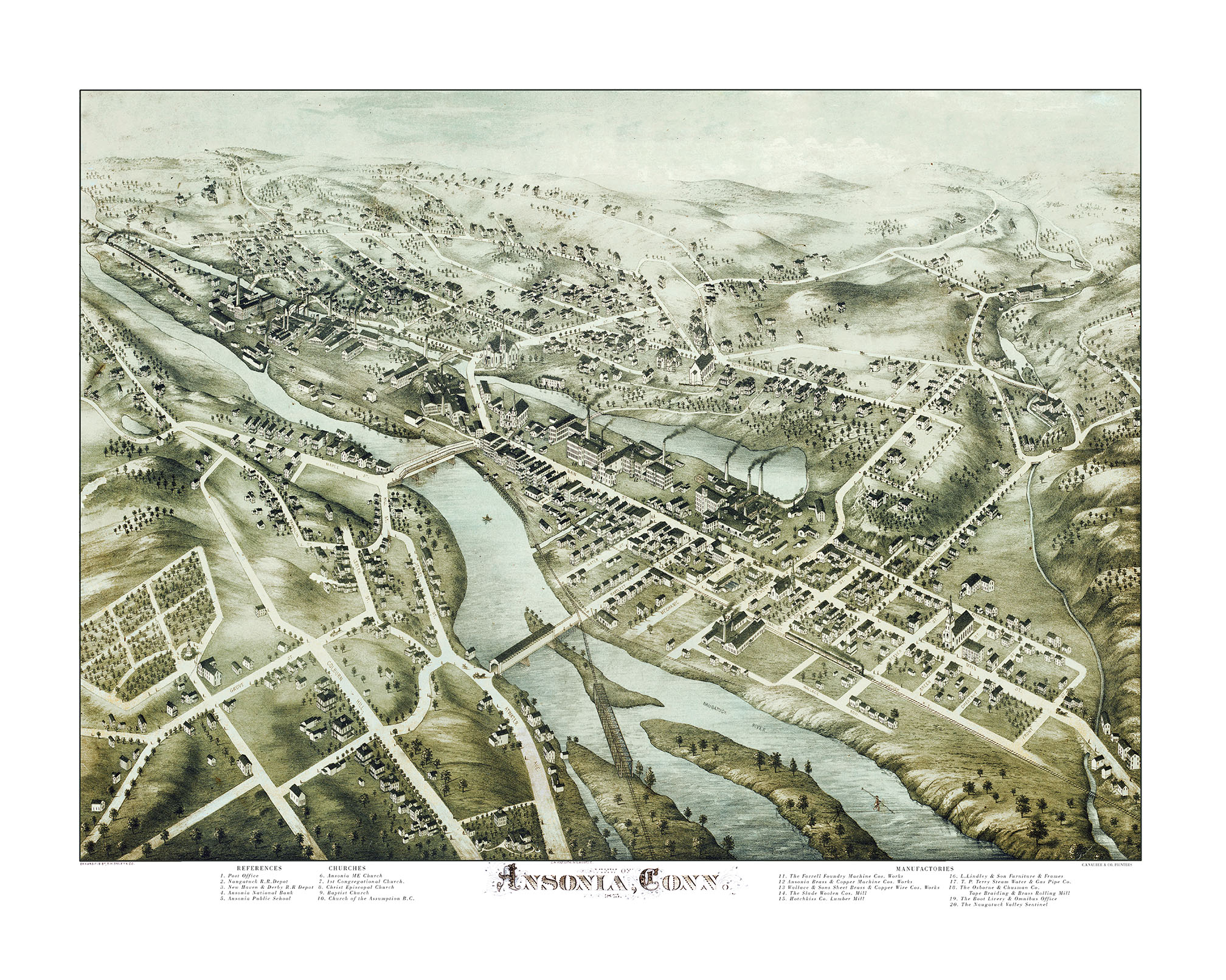 Full color fine art map of Ansonia, Connecticut in 1875. Perspective map is not to scale but gives a good relative representation of the buildings and streets in the 19th century. Brilliant colors, extremely fine detail.