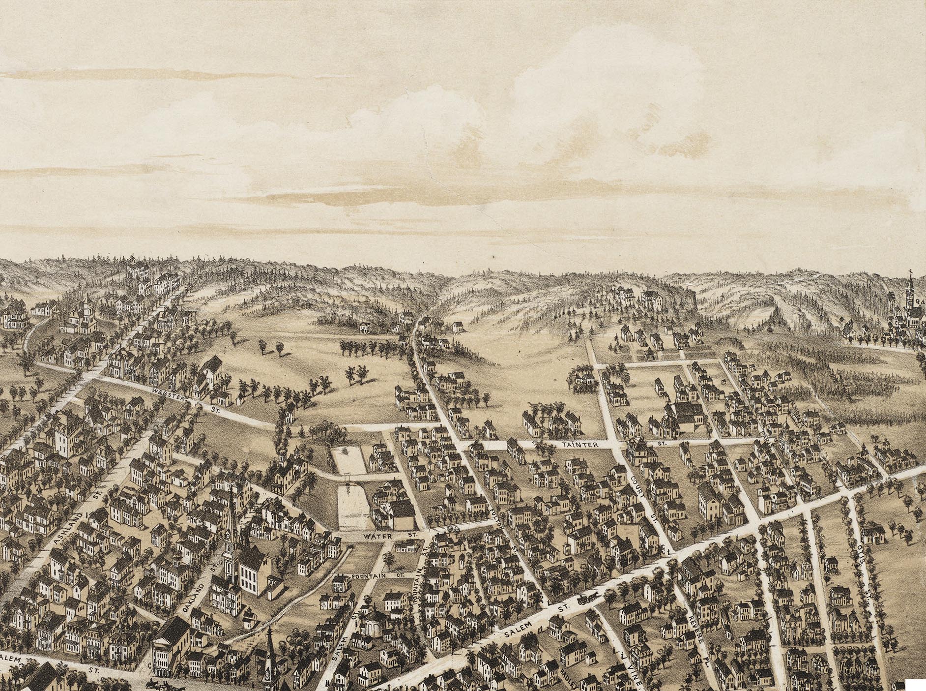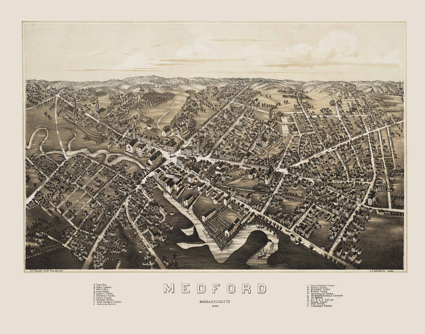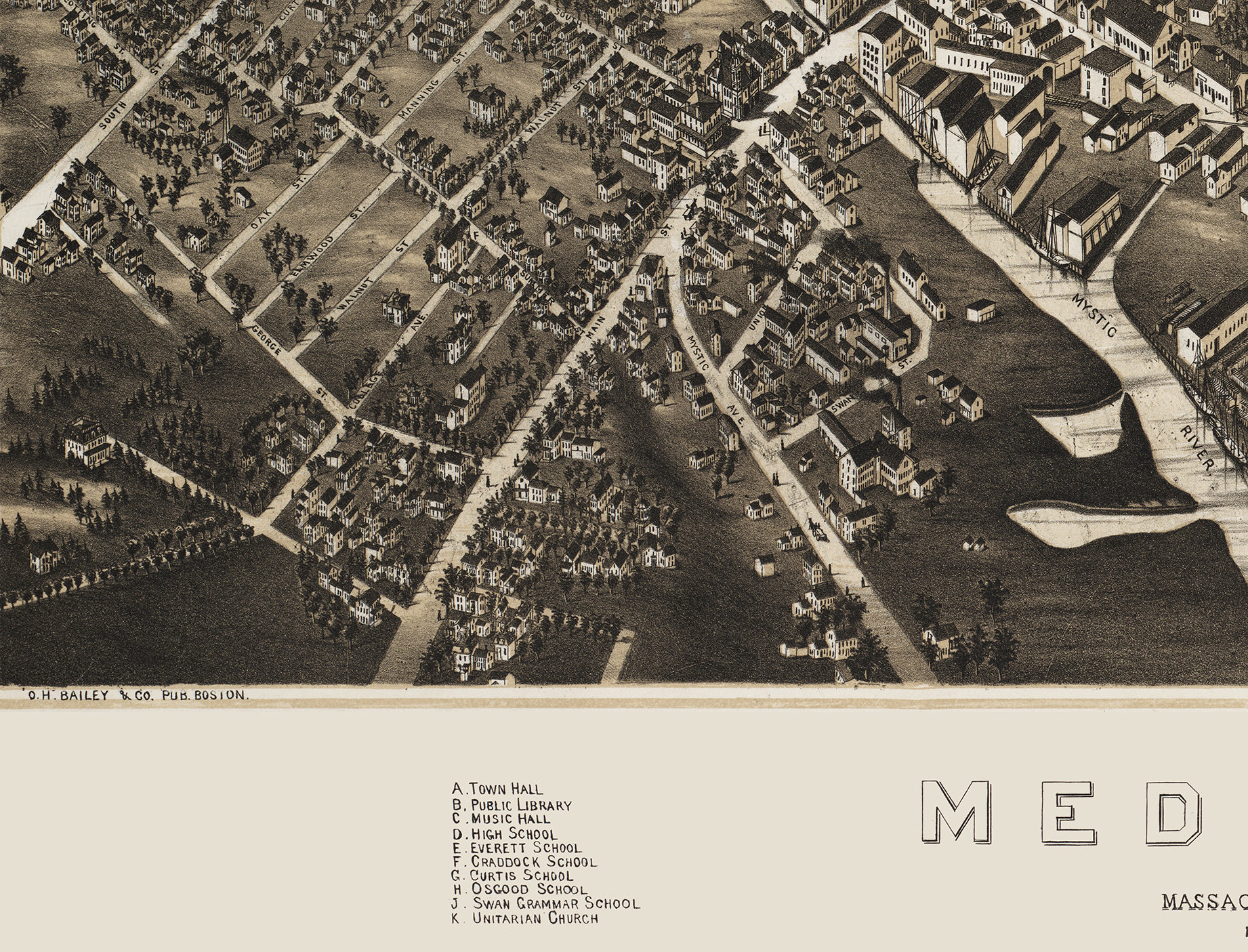 Medford, Massachusetts in 1880 - Bird's Eye View, Map, Aerial, Panorama, Vintage, Antique, Fine Art, Wall Art, History, Giclée
