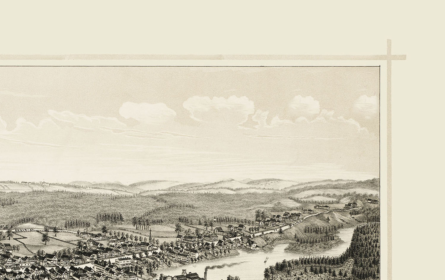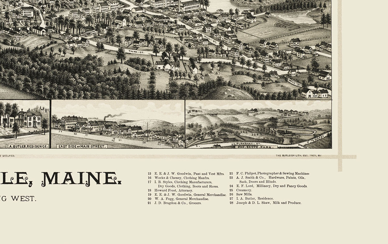 Springvale, Maine in 1888 - Bird's Eye View Map, Aerial, Panorama, Vintage, Antique, Reproduction, Giclée, Frameable, History, Fine Art