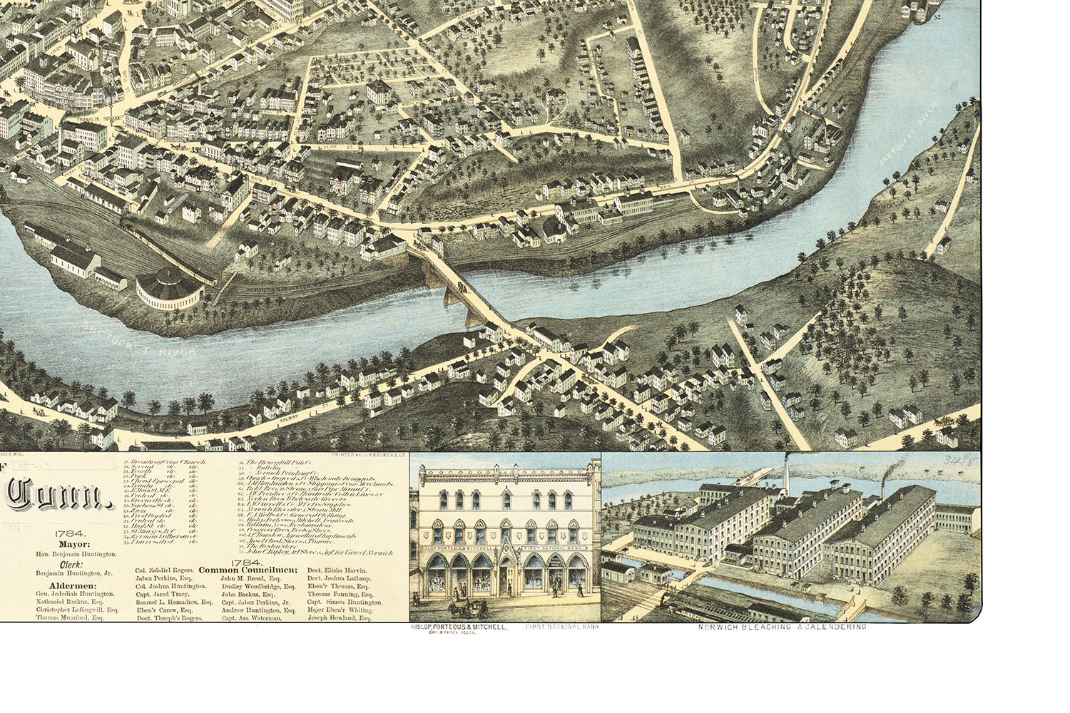 Full color fine art map of Norwich, Connecticut in 1876. Brilliant colors, extremely fine detail.