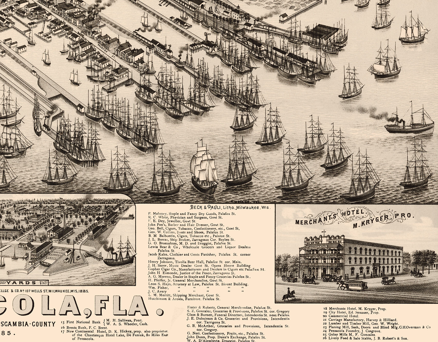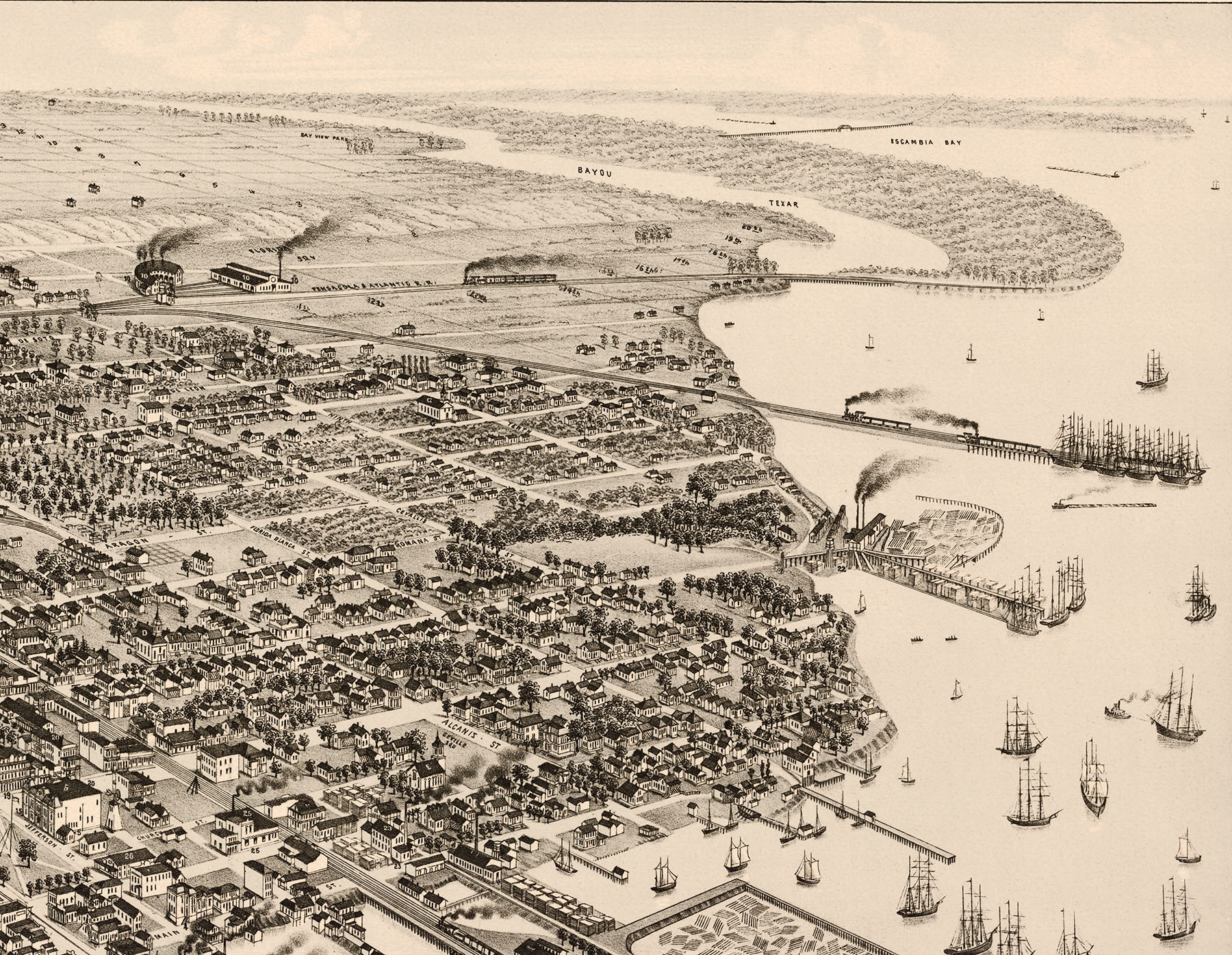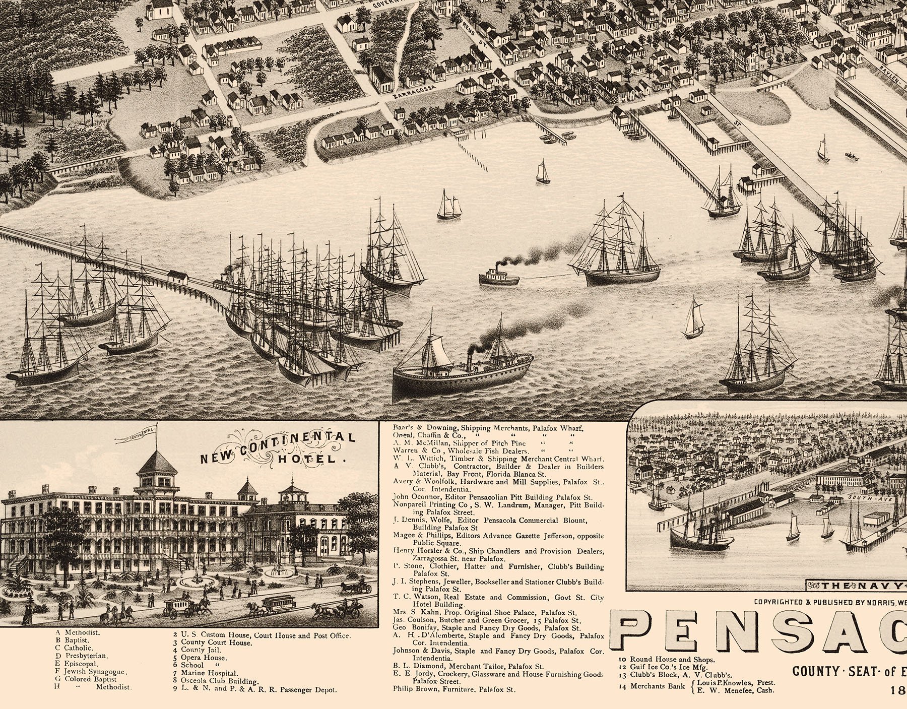 Pensacola, Florida in 1885 - Bird's Eye View, Aerial, Panorama, Vintage, Antique, Reproduction, Giclée, Fine Art, Wall Art, History