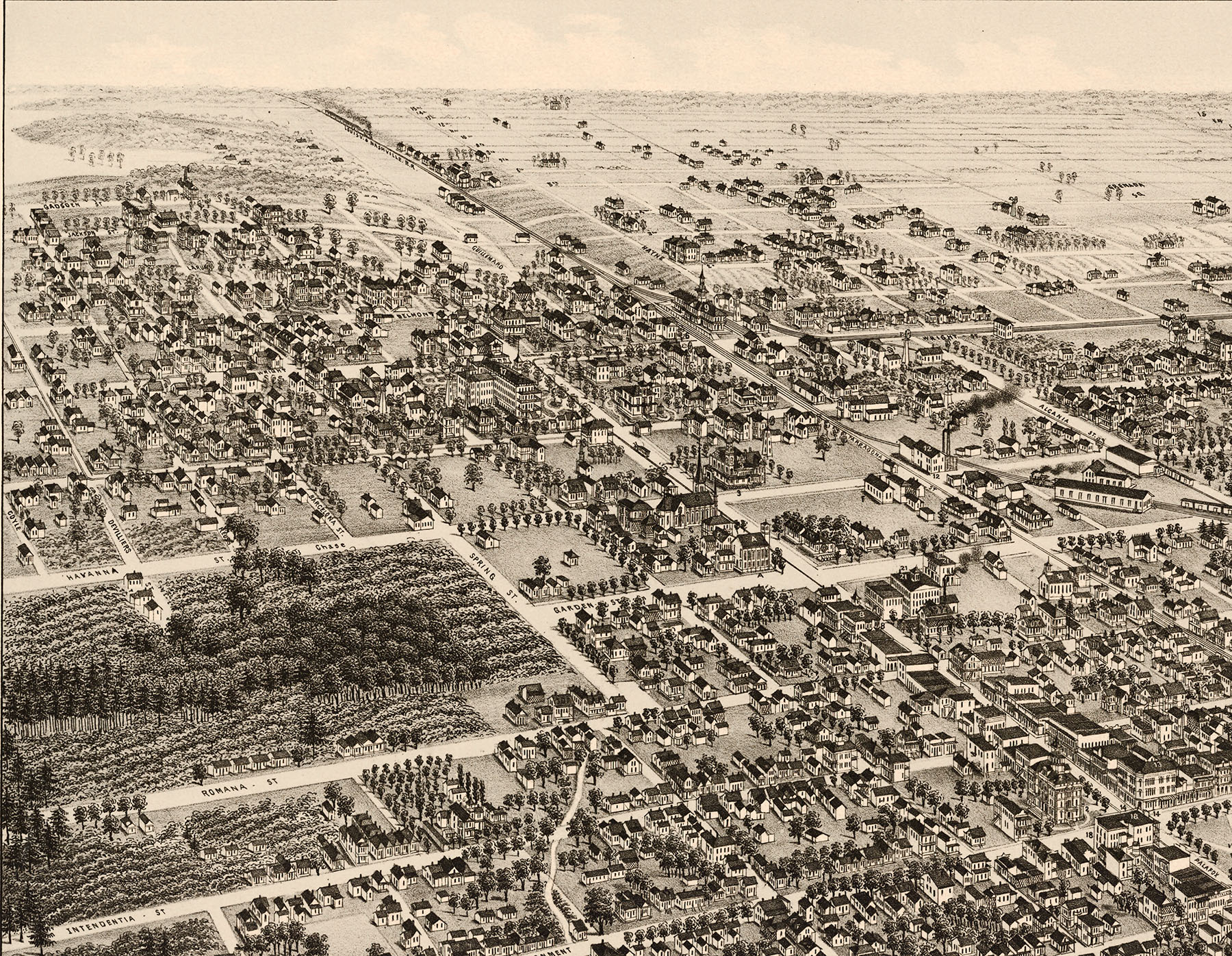 Perspective map is not to scale but gives a good relative representation of the buildings and the streets in the late 19th century. Fine detail is remarkable.