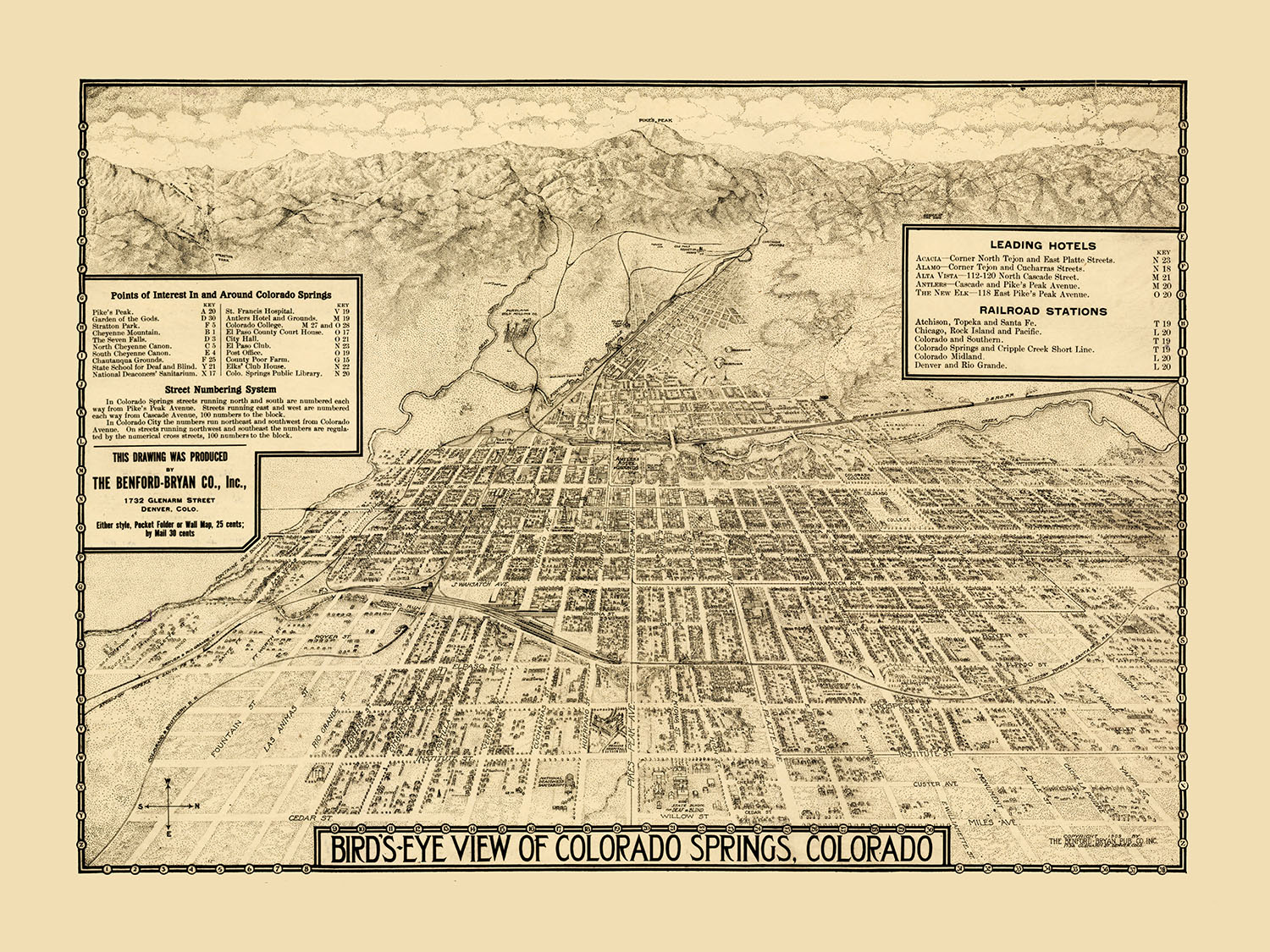 Colorado Springs Colorado in 1909 - Bird's Eye View Map, Aerial, Panorama, Vintage, Antique, Reproduction, Giclée, Fine Art, Wall Map, History