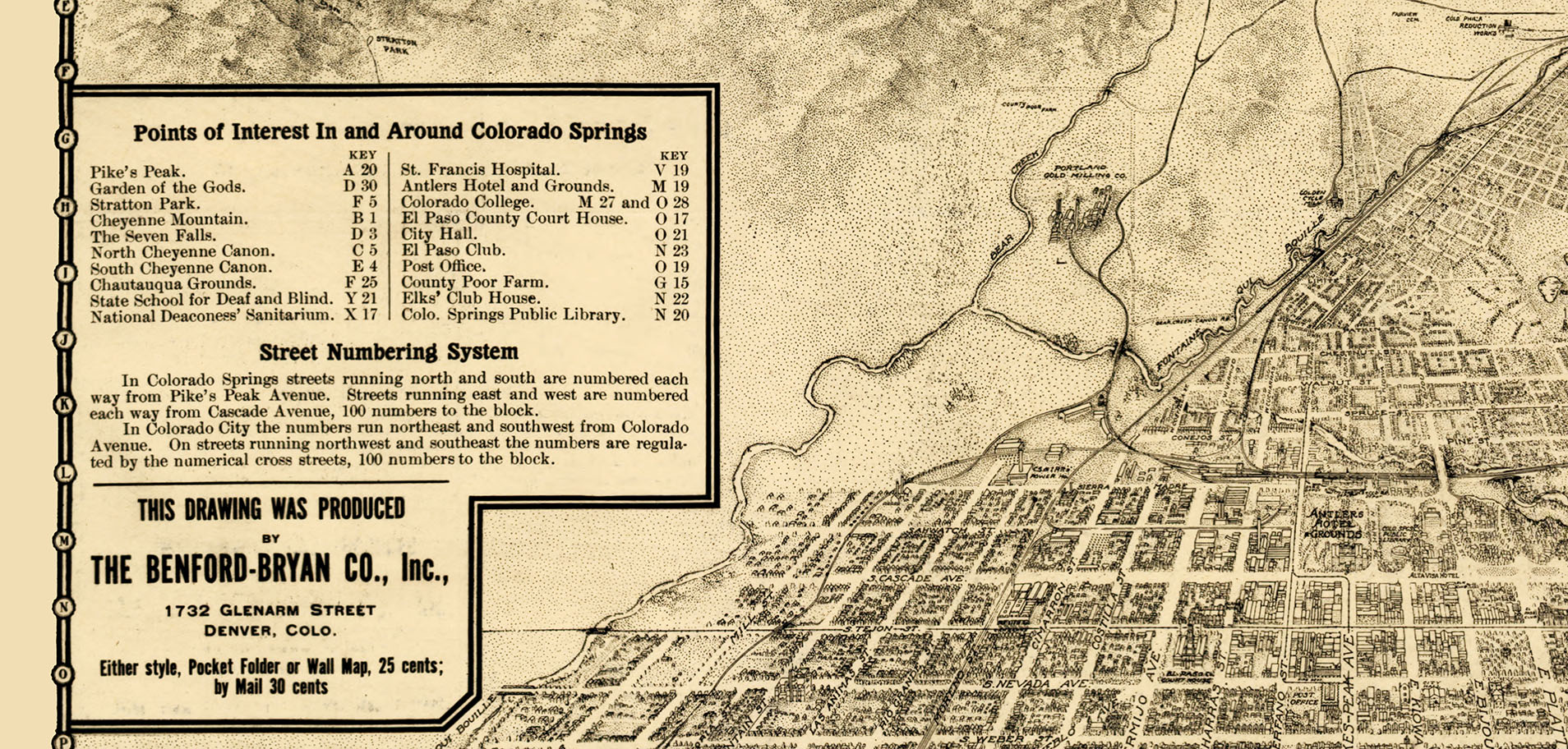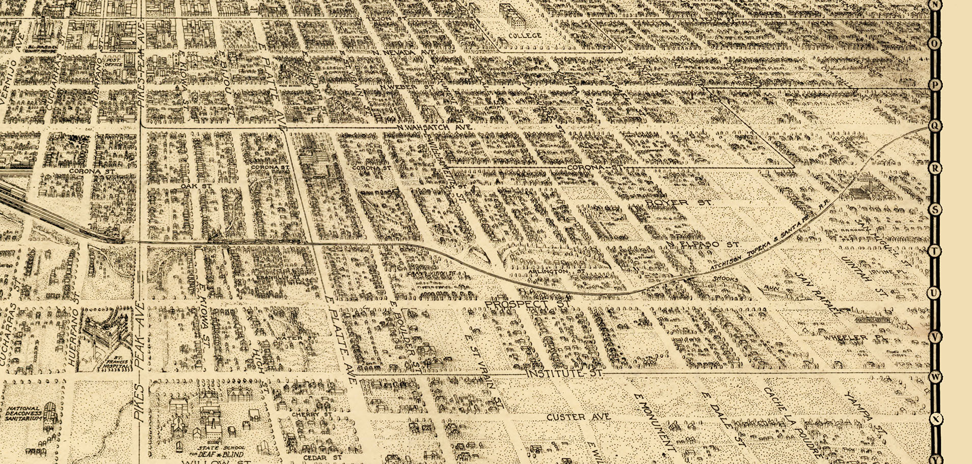 Sepia toned fine art map of Colorado Springs Colorado in 1909.