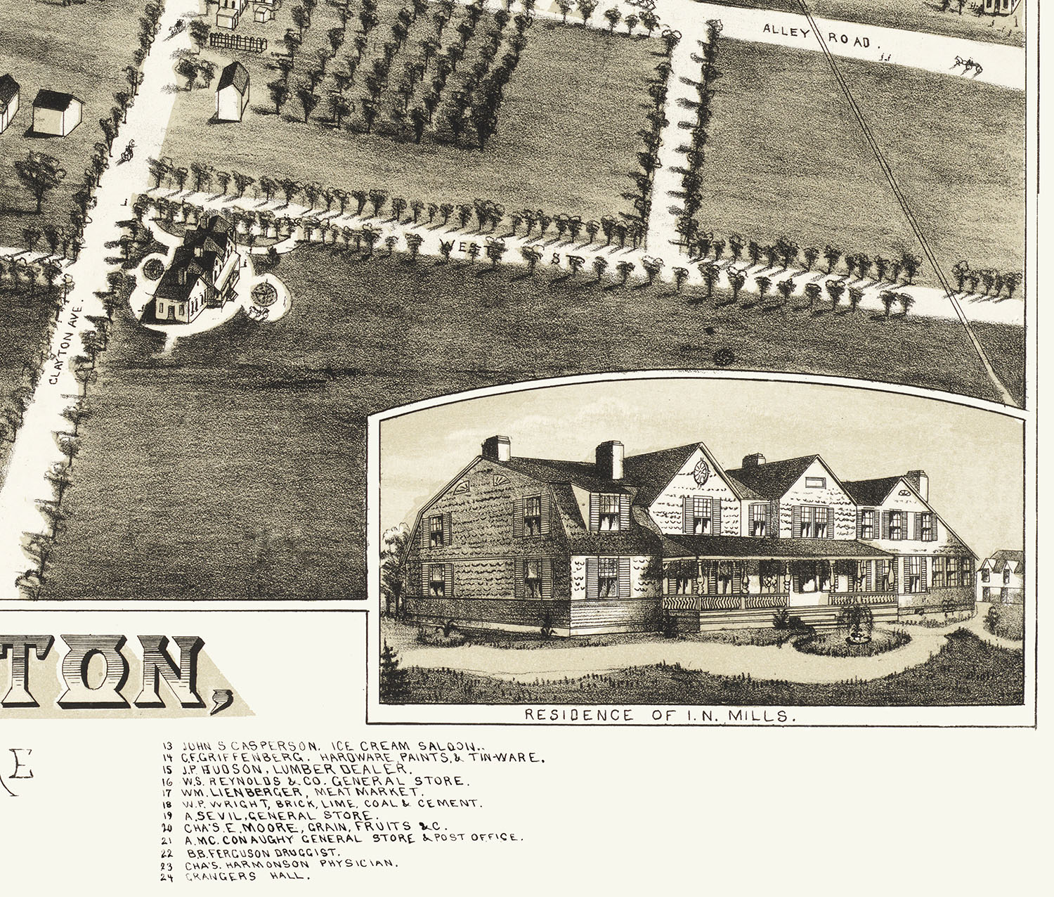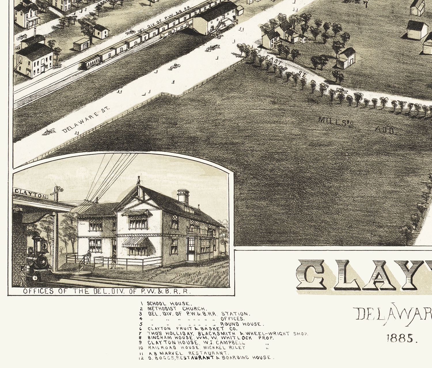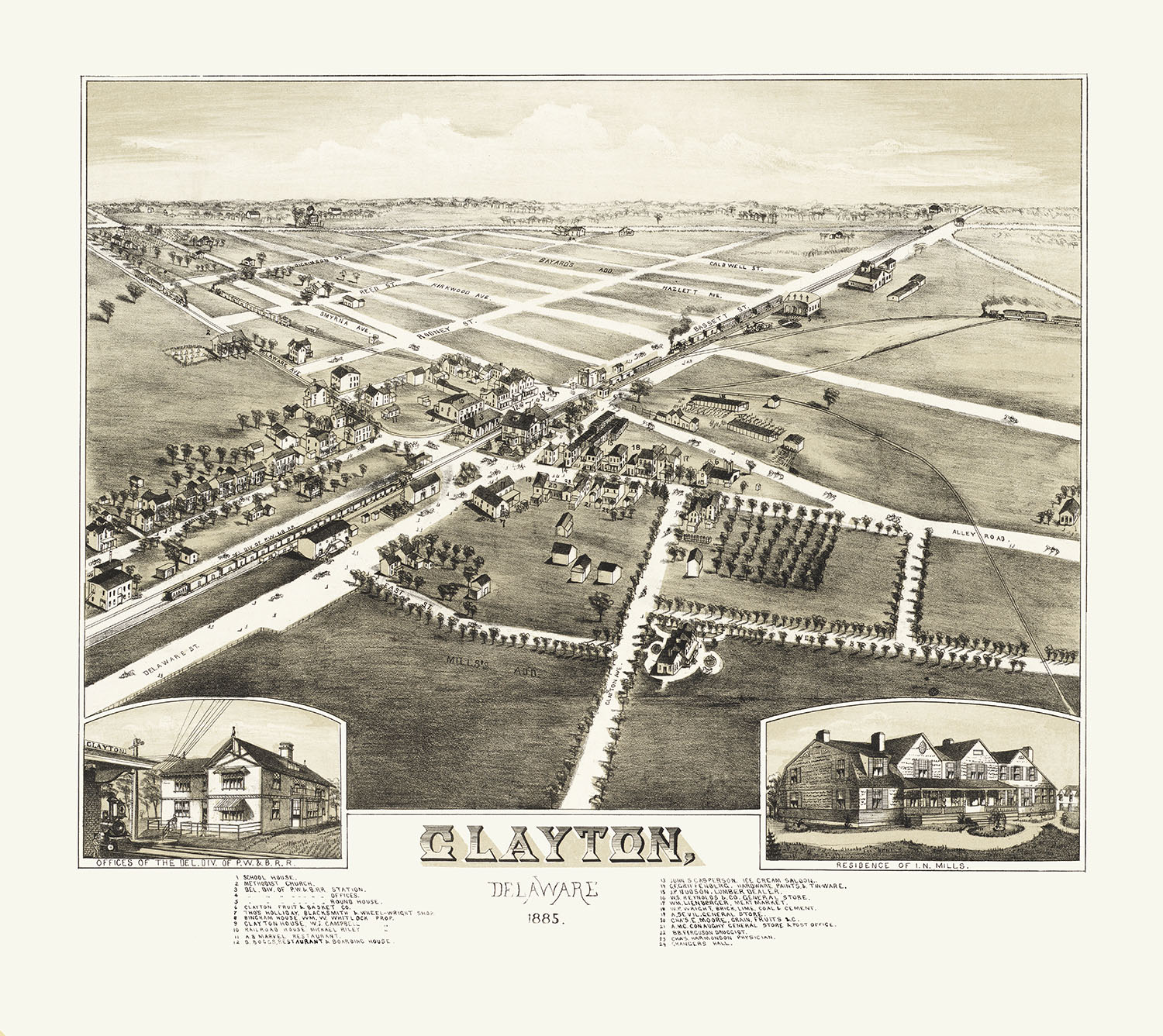 Clayton, Delaware in 1885 - Bird's Eye View, Aerial, Panorama, Vintage, Antique, Reproduction, Giclée, Fine Art, History