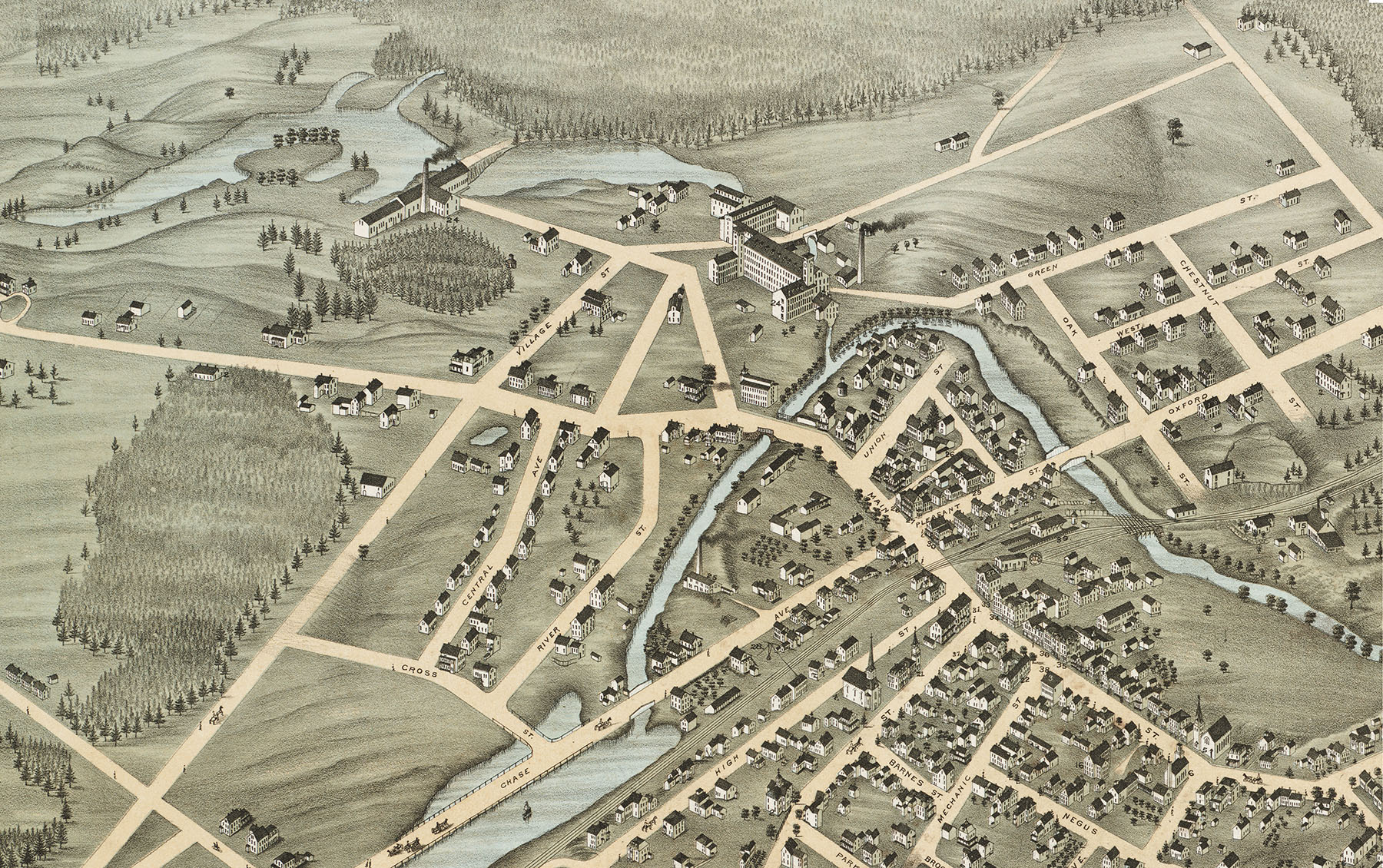 Full color fine art map of Webster, MA in 1878. Brilliant colors, fine detail.
