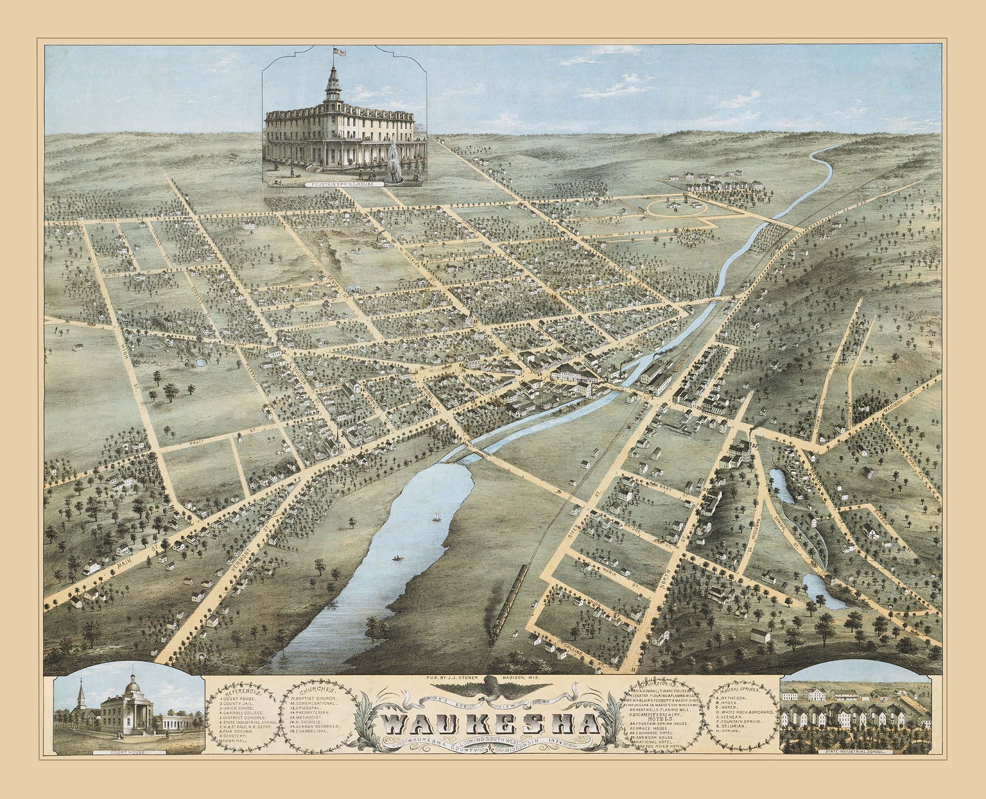 Waukesha, Wisconsin in 1874- Bird's Eye View Map, Aerial, Panorama, Vintage, Antique, Reproduction, Giclée, Fine Art, Wall Art, History