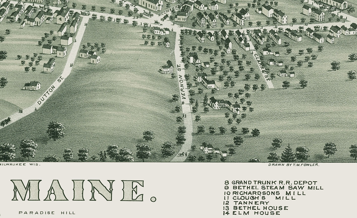 Duo-tone fine art map of Bethel, Maine in 1878. Extremely fine detail.