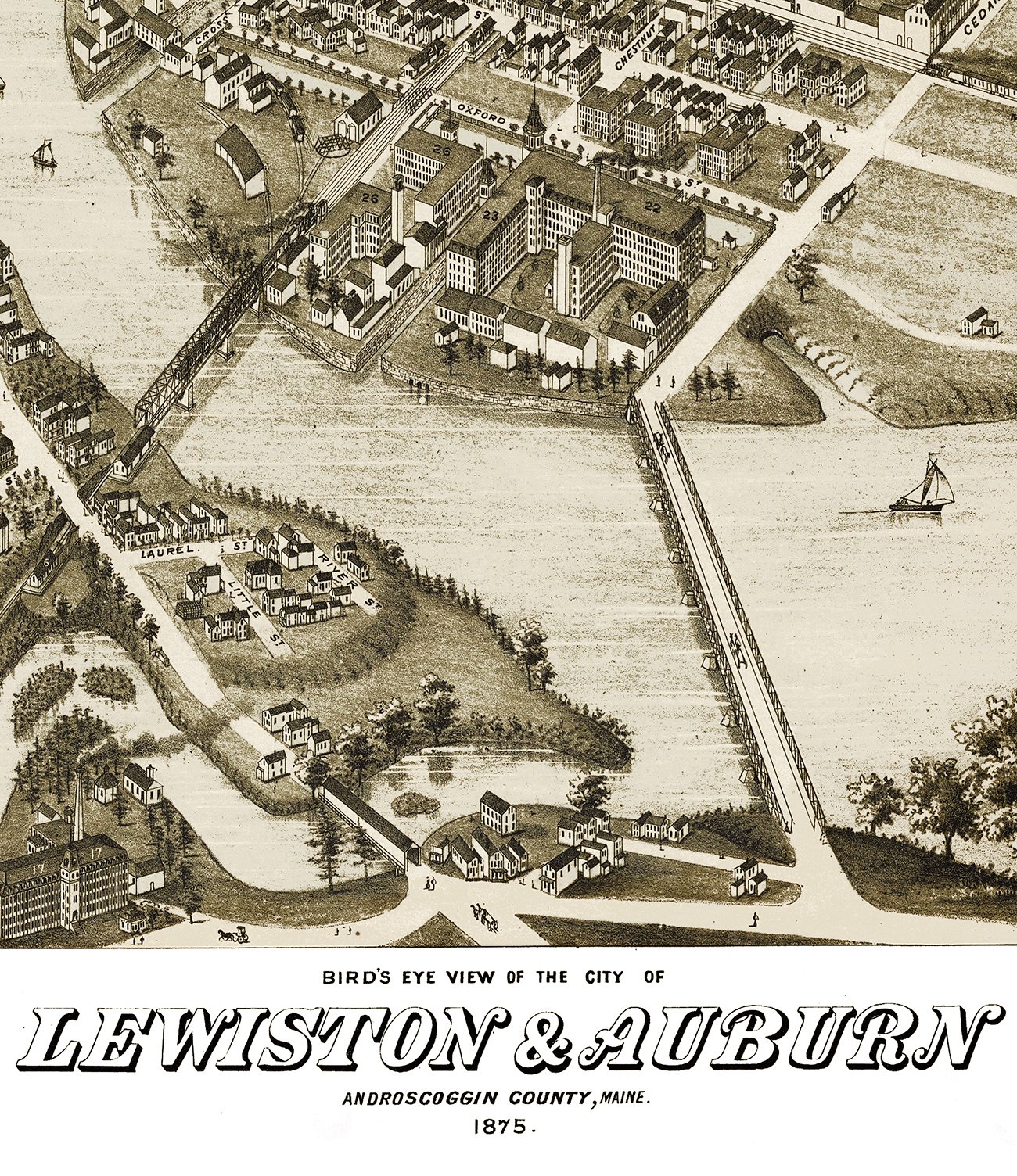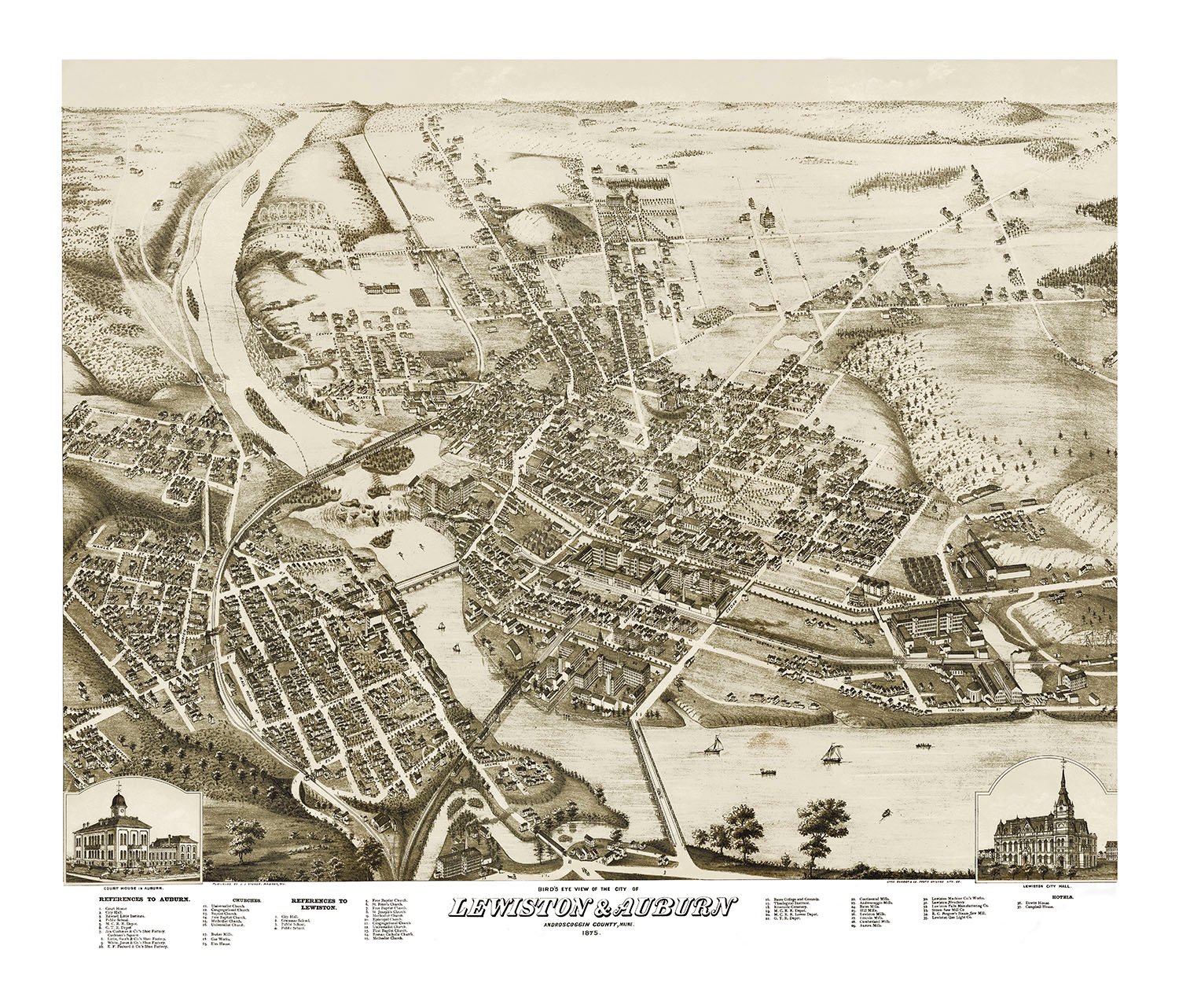 Lewiston and Auburn, Maine in 1875 - Bird's Eye View Map, Aerial, Panorama, Vintage, Antique, Reproduction, Giclée, History, Fine Art