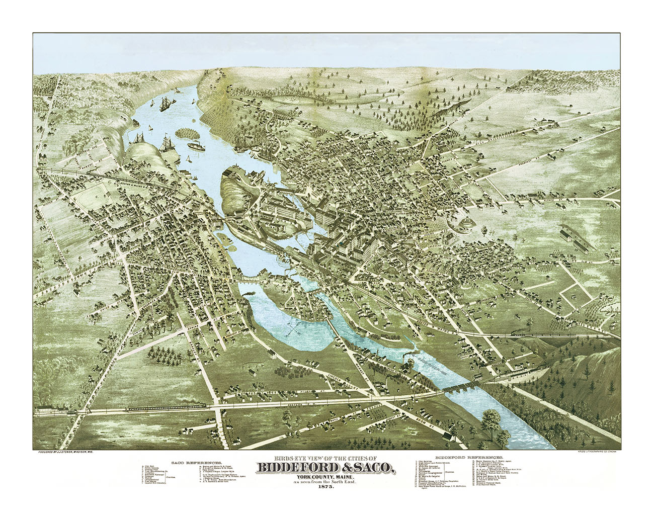 Biddeford & Saco, Maine in 1875 - Bird's Eye View Map, Panorama, Vintage Map, Antique Map, Wall Art, Home Decor, Fine Art, History