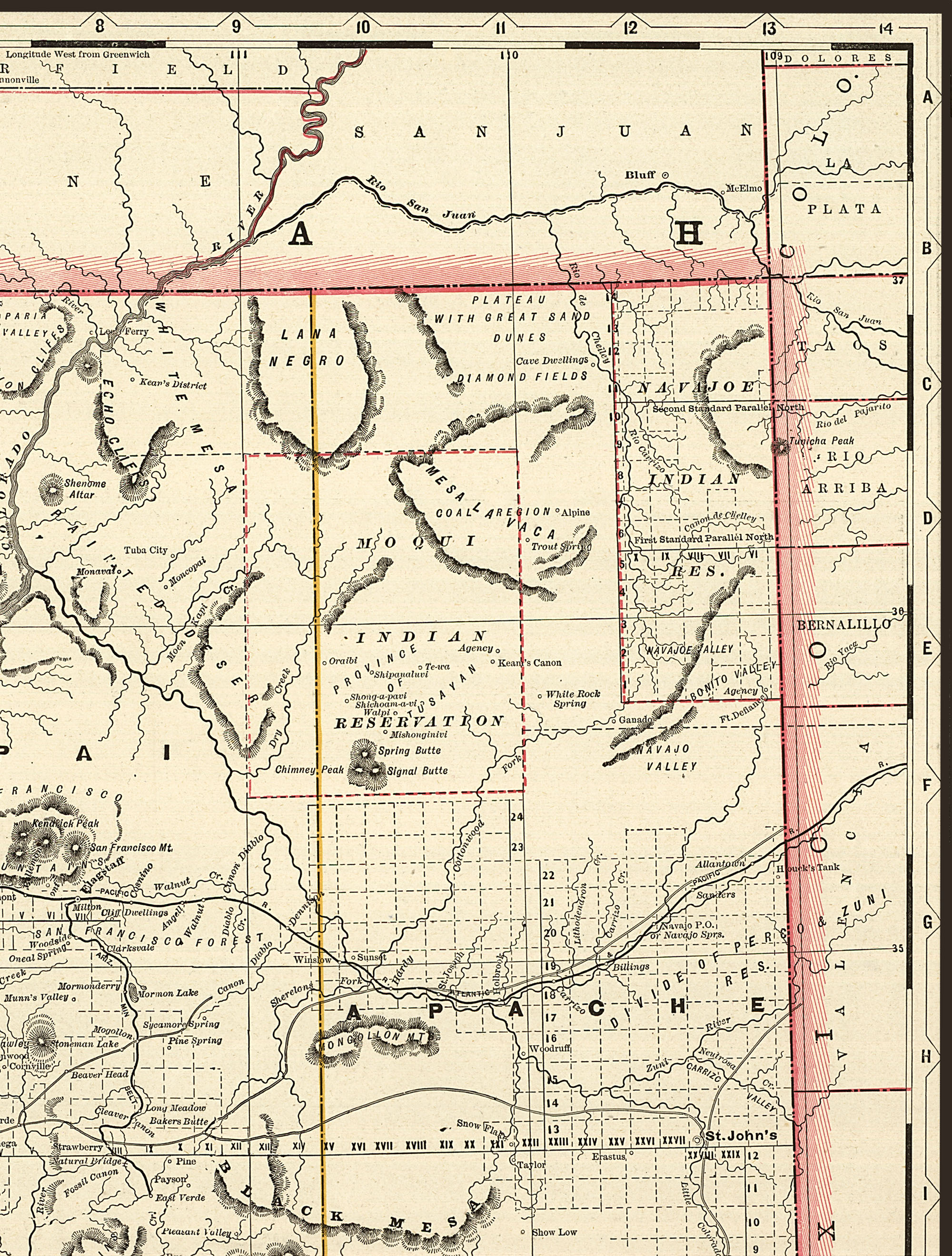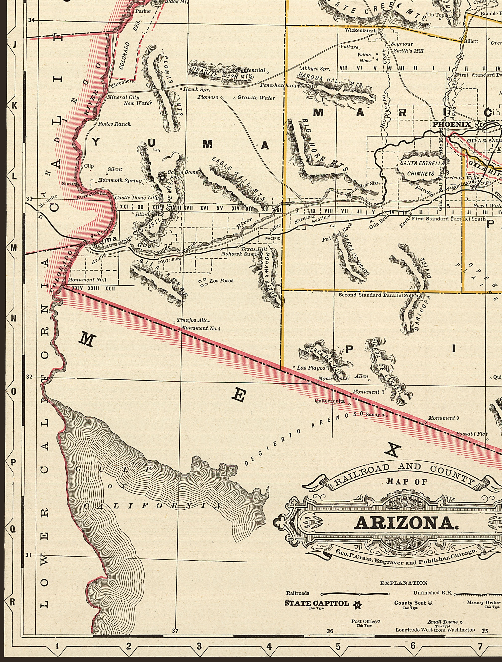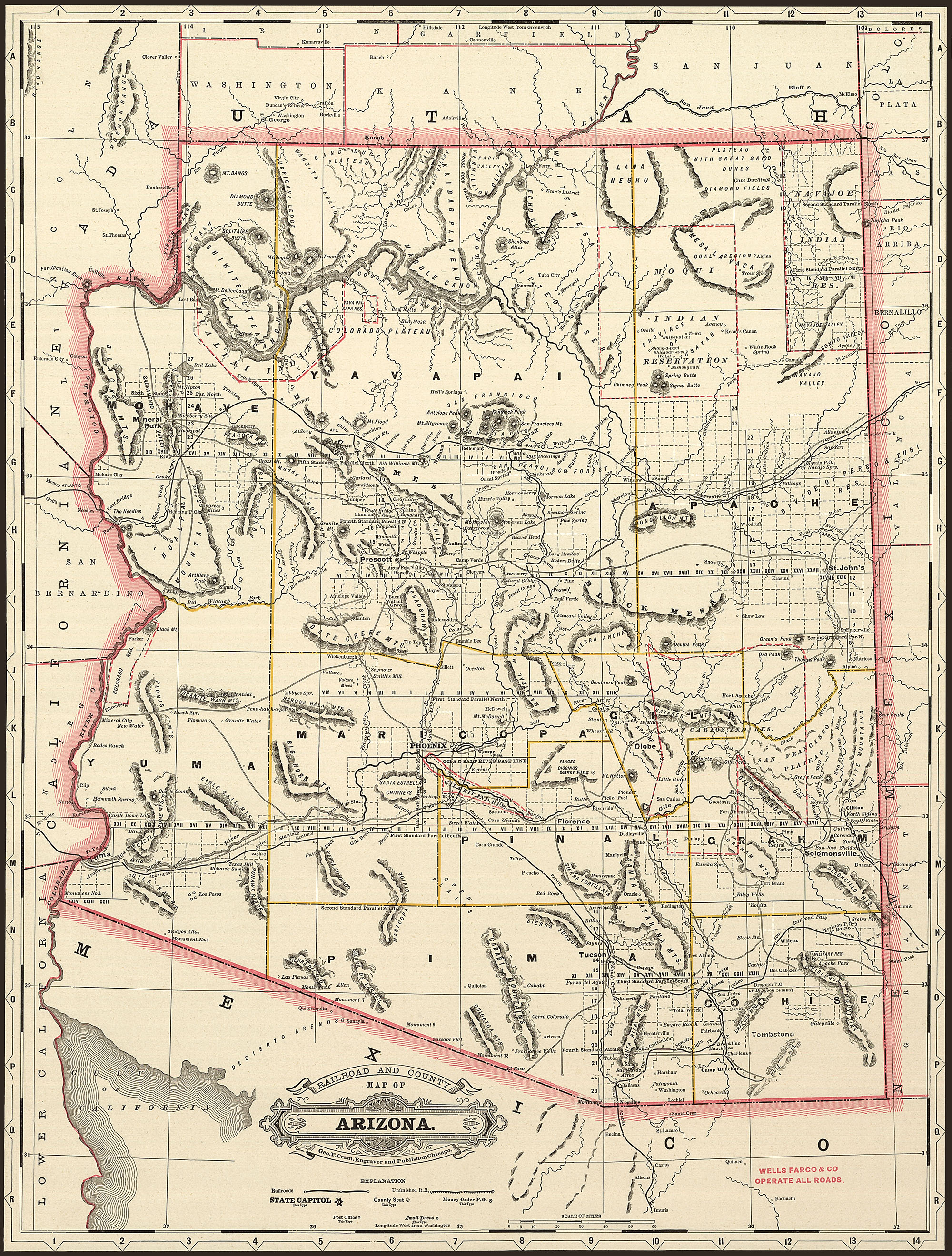 Sepia tone fine art map of the Arizona Counties & Railroad in 1887. Fine detail is remarkable.