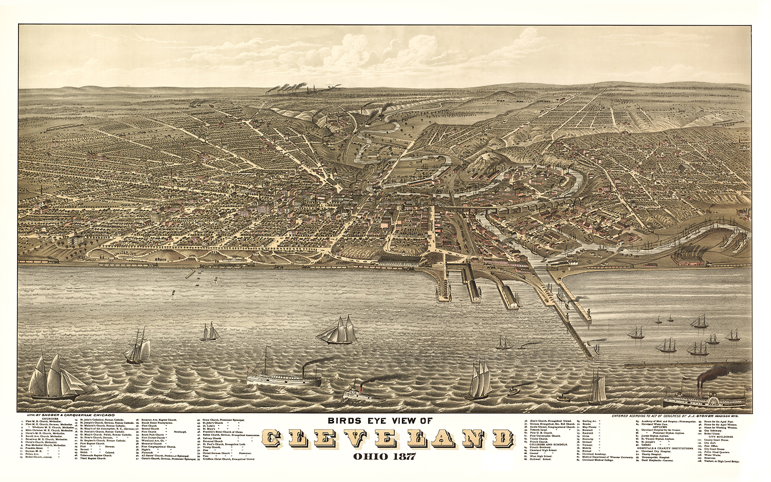 Cleveland, Ohio in 1877 - Bird's Eye View Map, Aerial, Panorama map, Vintage map, Antique map, Reproduction, Giclée, Framable map, Fine Art
